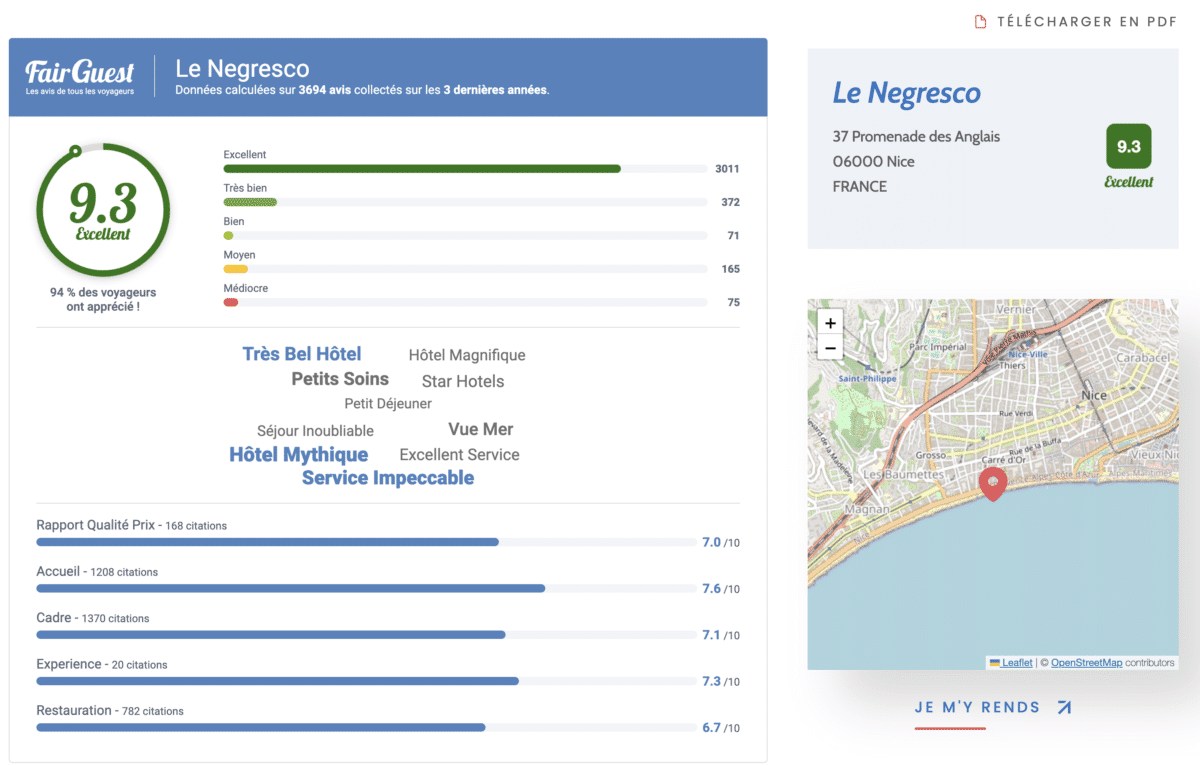 Désormais, les clients peuvent retrouver sur le site Explore Nice Côte d’Azur les avis récoltés pour les établissements, déjà référencés par FairGuest, avec une note globale pour chaque établissement et une note plus détaillée pour chaque critère (restauration, accueil, rapport qualité/prix, cadre, …) facilitant ainsi la prise de décision pour une réservation future. Les partenaires, quant à eux, peuvent également connaître en un seul clic, leur note attribuée et les points d’amélioration si besoin.