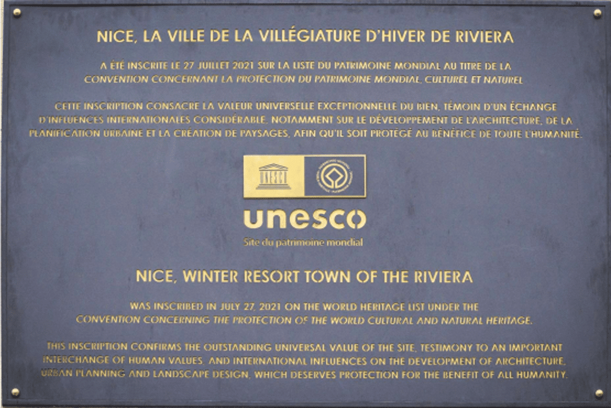 Depuis 2021, une partie de la ville de Nice est inscrite sur la liste du patrimoine mondial par l’UNESCO au titre de « Ville de villégiature d’hiver de Riviera ». L’Office de Tourisme Métropolitain Nice Côte d’Azur s’attache à valoriser cette distinction par l’UNESCO en proposant des outils et dispositifs toujours plus innovants : visite virtuelle, application, balisage dans les rues…