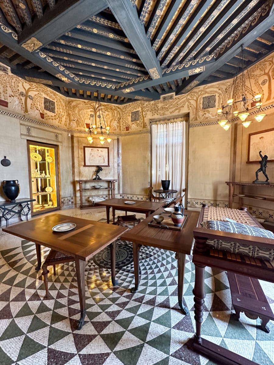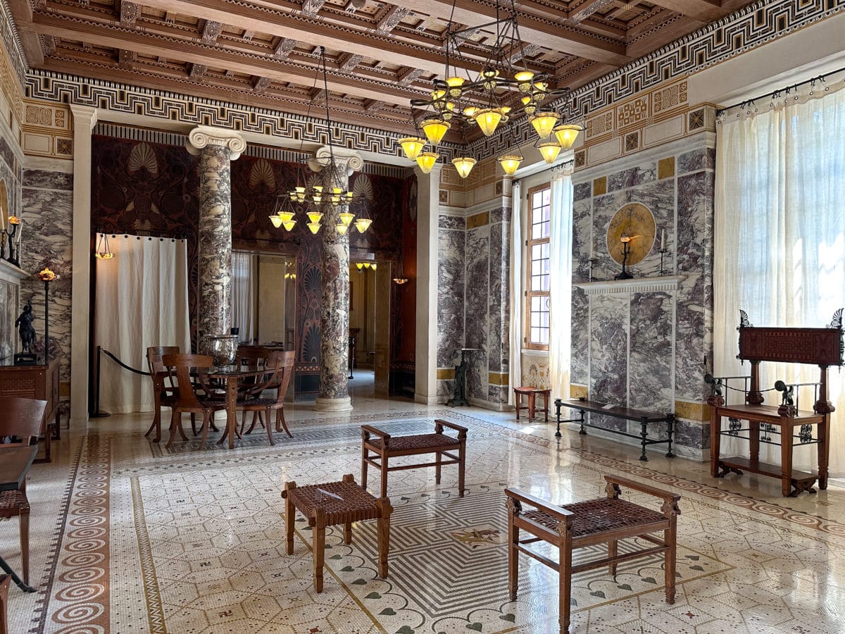 Le commanditaire de cette demeure, Théodore Reinach, est un épris de Grèce antique qui souhaite s’inspirer d’une maison grecque de Délos du IIe siècle av. J-C. C’est l’architecte Emmanuel Pontremoli qui donnera vie à ce projet, accompagné des meilleurs artistes et artisans de l’époque.