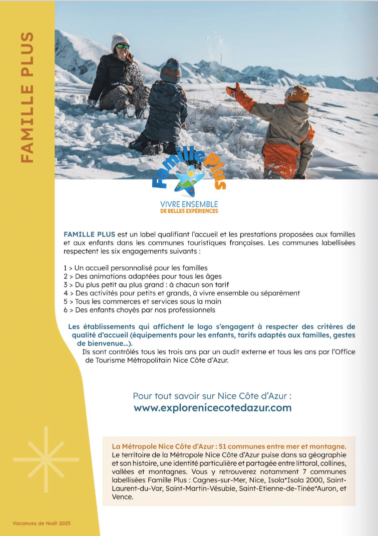 L’obtention de ce label permet aux divers prestataires d’une destination d’être reconnus comme établissement accueillant les enfants et les familles et offrant un accueil adapté à leurs besoins, avec des tarifs et des prestations spécialement prévus pour eux. Les établissements qui affichent le logo FAMILLE PLUS s’engagent à respecter des critères de qualité d’accueil (équipements pour les enfants, tarifs adaptés aux familles, gestes de bienvenue…). Ils sont contrôlés tous les trois ans par un audit externe et tous les ans par l’Office de Tourisme Métropolitain Nice Côte d’Azur.