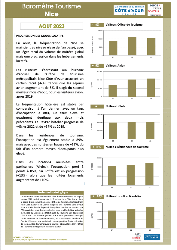 Retrouvez, ci-dessous, les données statistiques du tourisme à Nice pour ce mois d’août 2023 et celles des mois écoulés.