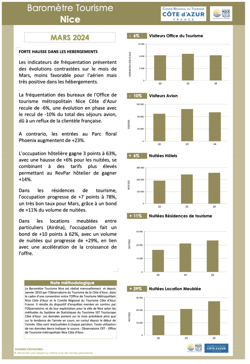 Retrouvez, ci-dessous, les données statistiques du tourisme à Nice pour le mois de mars 2024 et celles des mois écoulés.
