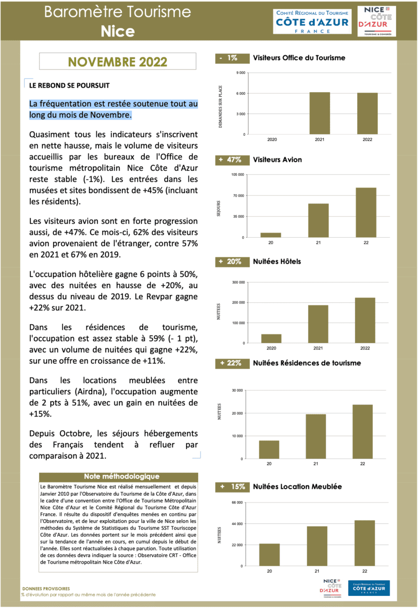 Sur les 11 premiers mois de l’année 2022, les rebonds sont significatifs : + 148 % de visiteurs avion avec une belle proportion d’étrangers, + 134 % de fréquentation dans les bureaux d’information touristique de Nice, + 82 % de nuitées en hôtellerie…