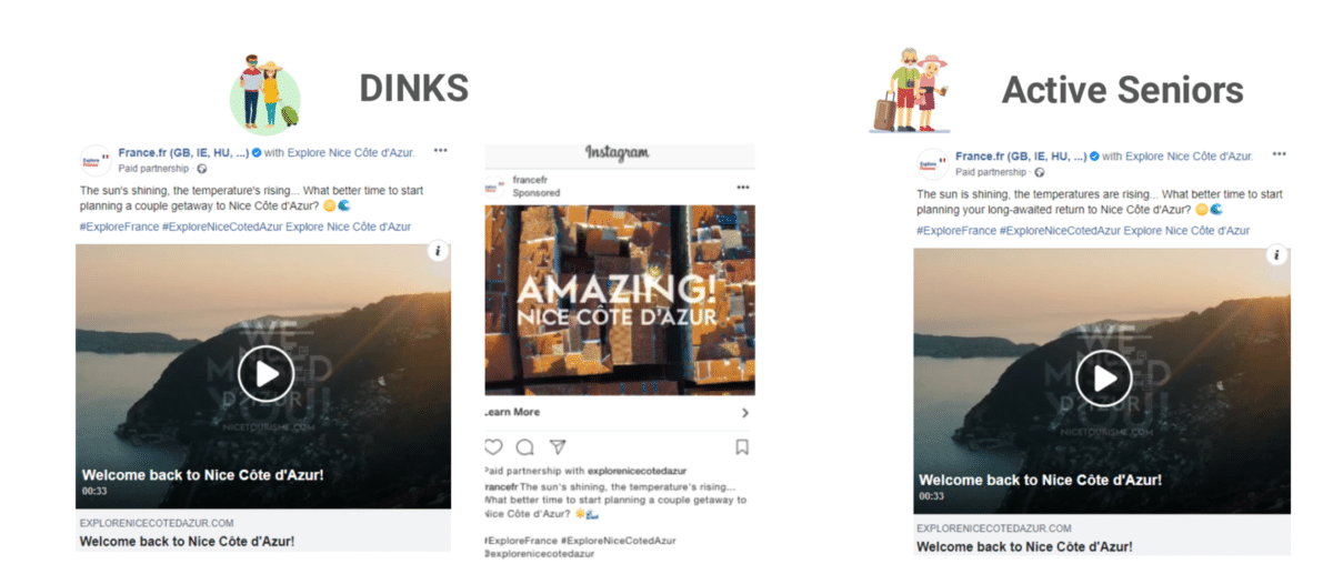 Les DINKS* semblent avoir été plus réceptifs à la vidéo, représentant près de 80% des vues. Enfin, même si elles avaient un objectif de vues, les publicités ont aussi généré plus de 1200 clicks, ce qui est un bon bonus et reflète un bon intérêt pour la destination Nice Côte d’Azur chez ces cibles.