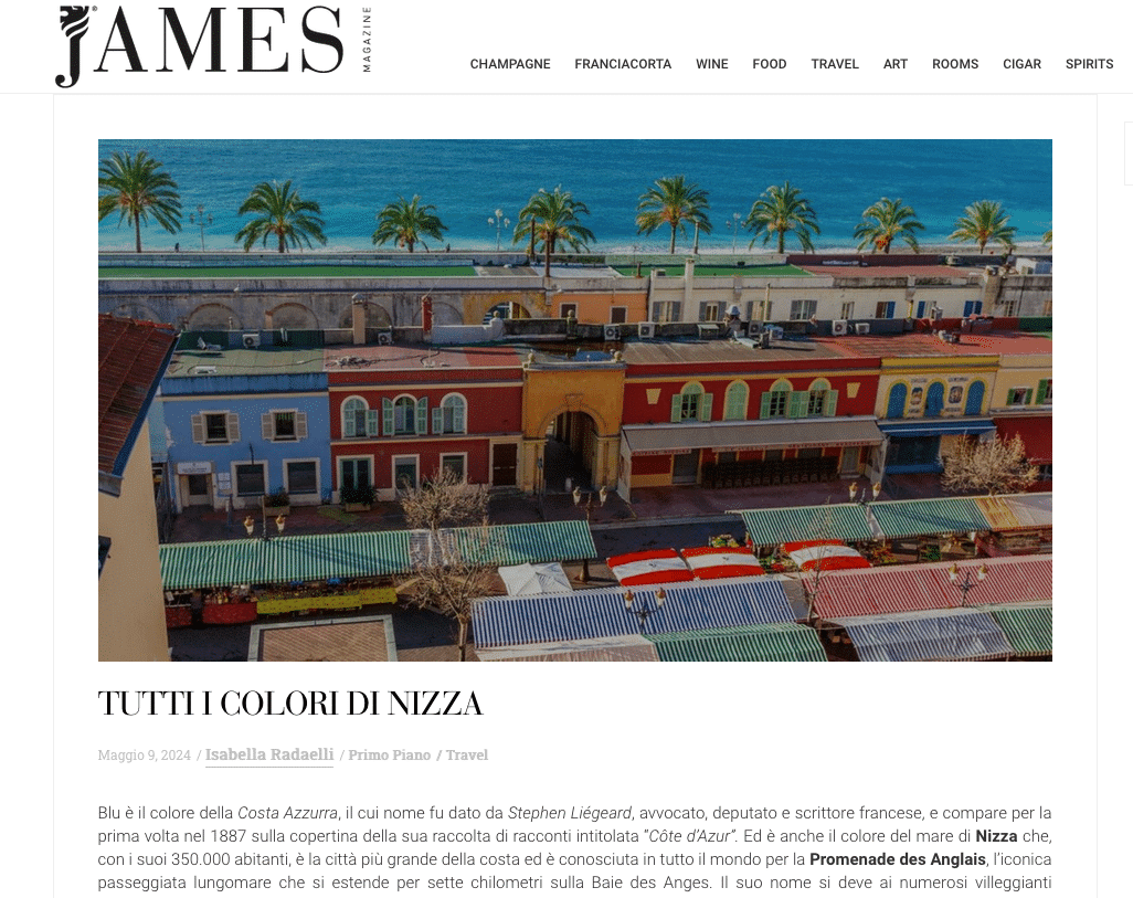 Suite à un accueil réalisé en avril dernier, un article joliment illustré est paru sur le site web de James Magazine, revue spécialisée luxe, sous le titre « Toutes les couleurs de Nice ».