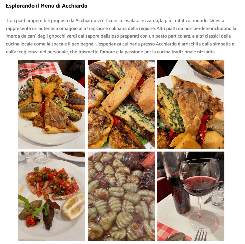 Le blog italien spécialisé vins et cuisine « Leonardo Romanelli » a publié un article sur « Nice, perle de la Côte d’Azur » qui met en avant le vin de Bellet, la Cuisine Nissarde et son label ainsi que l’inscription de Nice sur la liste du patrimoine mondial de l’Unesco. Sont également cités plusieurs établissements niçois : Acchiardo, Pâtisserie Moutet, Le Grand Balcon.