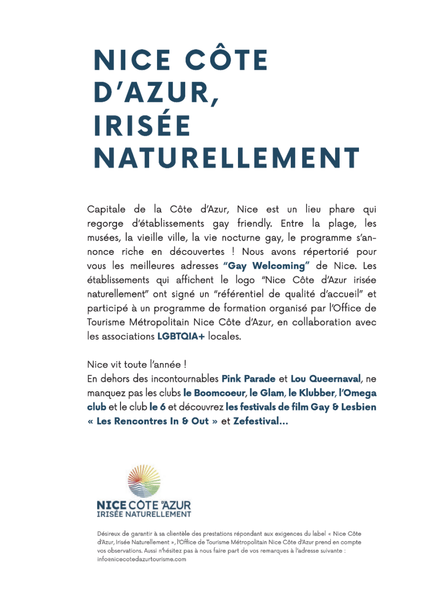 Pour rappel, ce label a été lancé en 2011 par l’OTM NCA et vise à attester de la qualité de l’offre touristique gay friendly. Les établissements labellisés sont régulièrement visités afin de vérifier la bonne mise en application des engagements du label. Des séminaires sont également organisés chaque année par l’OTM NCA, en collaboration avec les associations locales, afin d’aider ces établissements à se former au bon accueil de la clientèle LGBTQIA+.