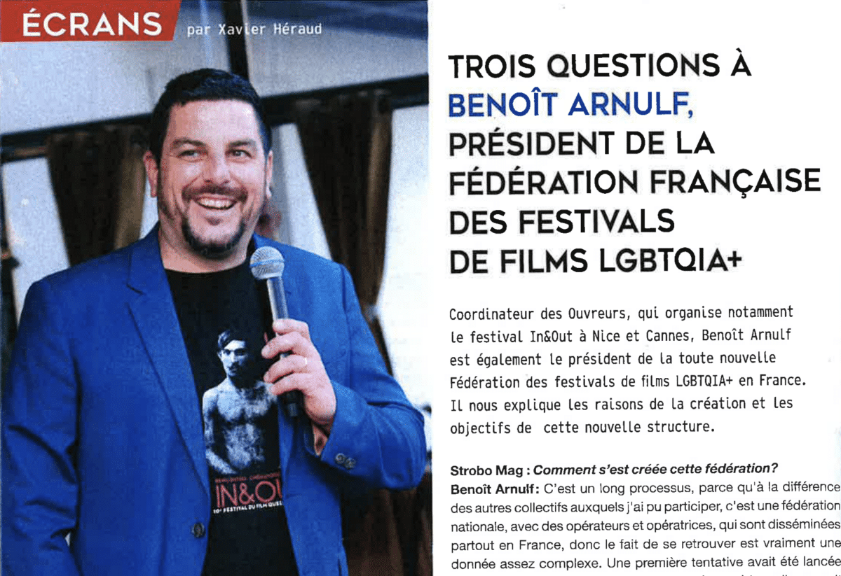 • une interview de Benoît ARNULF, Président de la Fédération Française des Festivals de Film LGBTQIA+ qui organise, notamment, le festival In&Out Nice