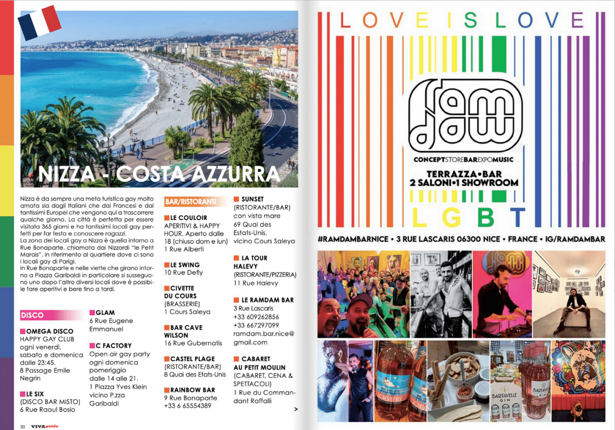 Le web-magazine italien Vivaboy a consacré 4 pages à Nice Côte d’Azur dans son édition estivale. Y sont présentés plusieurs établissements de la vie LGBTQIA+ métropolitaine (bars, restaurants, discothèques..).