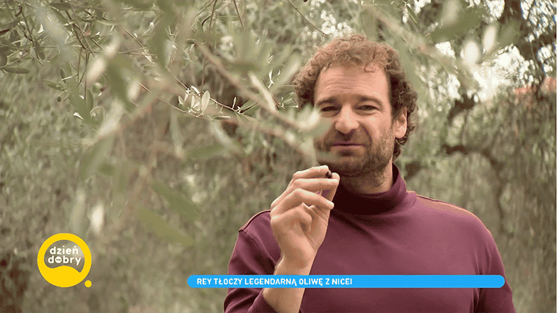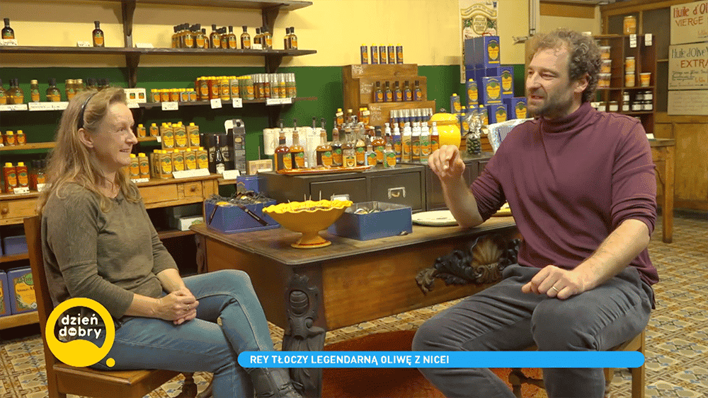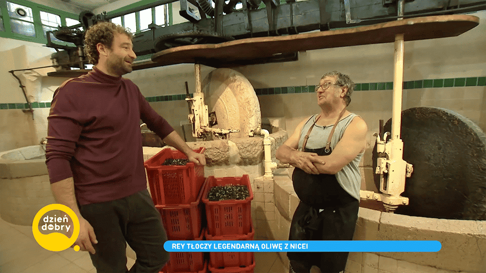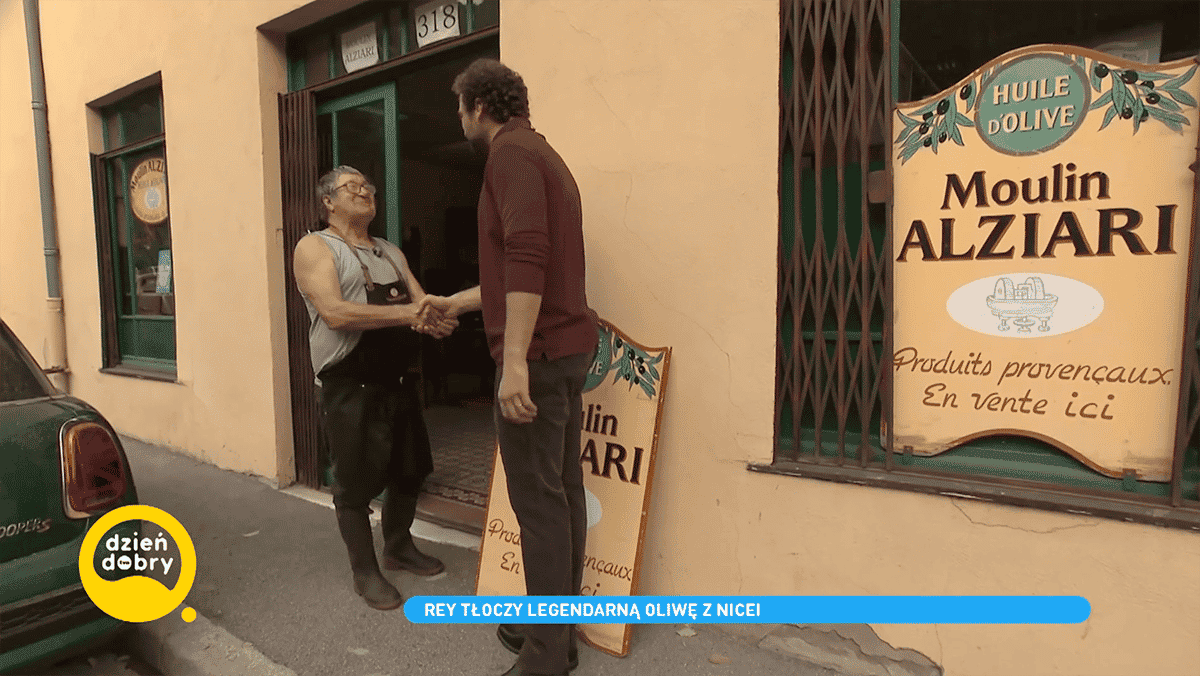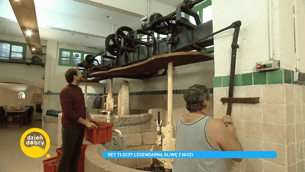 Nicolas Rey était également allé au devant de Robert Luminet, oléiculteur au Moulin Alziari. Construit au milieu du XIXe siècle, le Moulin Alziari est le seul encore en fonction à Nice et le dernier moulin d’Europe à fonctionner encore dans un savoir-faire dit à la « gênoise ». L’oléiculteur niçois a expliqué au chroniqueur le processus de fabrication de l’huile vierge pressée à froid (il faut environ 170 kg d’olives pour obtenir 40 litres d’huile). L’animateur franco-polonais s’était ensuite rendu à la boutique Alziari pour y déguster l’huile d’olive produite par le moulin.