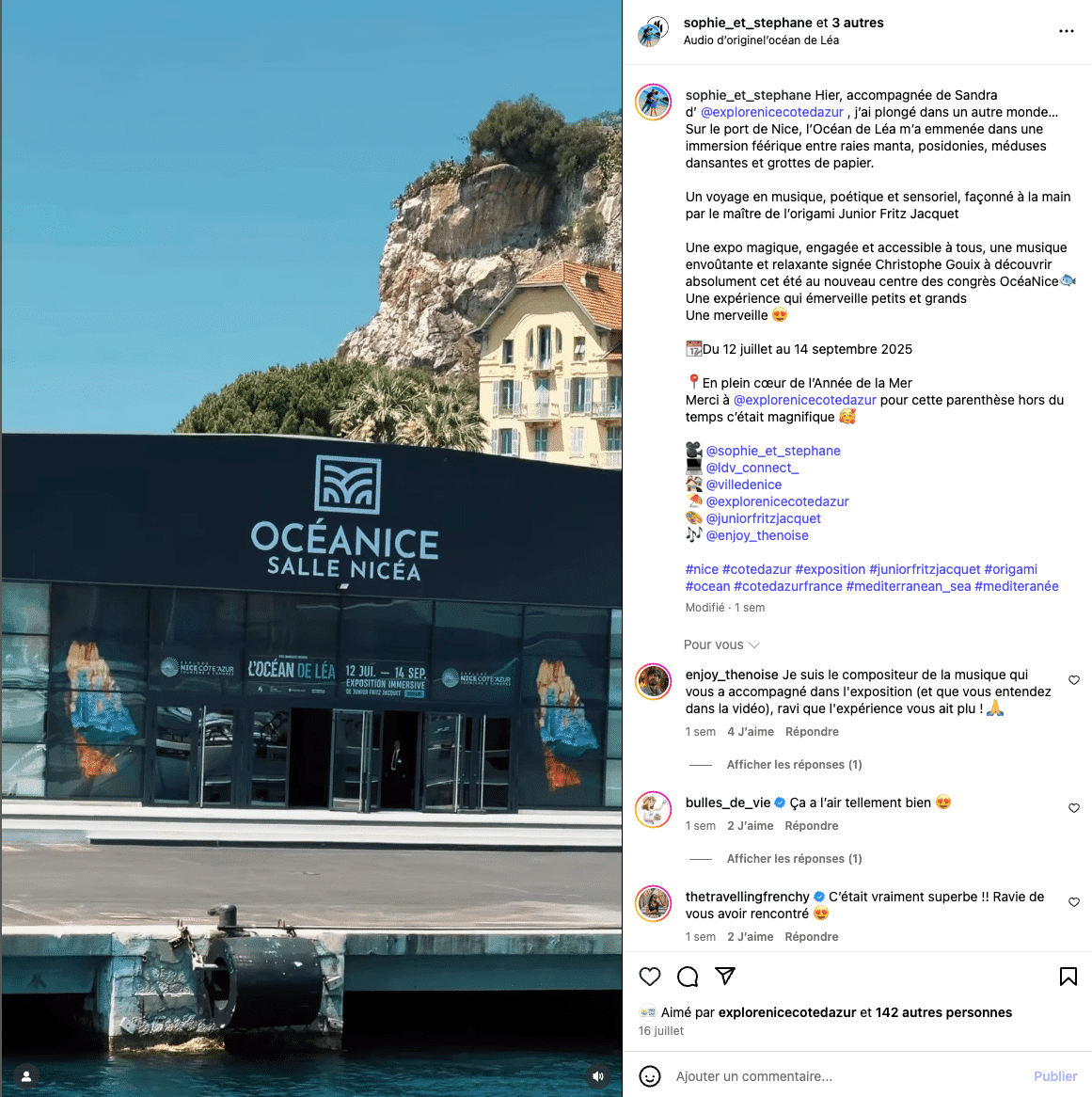 Grâce à ces relais d’opinion, “L’Océan de Léa” dépasse les murs du centre des Congrès OcéaNice pour s’inviter dans les stories, posts et feeds des réseaux sociaux.