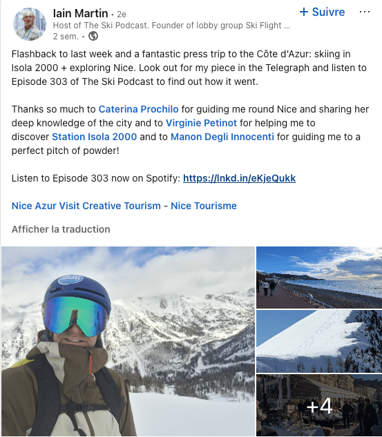 - Article et podcast sur la station de ski d’Isola 2000 dans The Telegraph.co.uk (Royaume-Uni) – 27 millions d’utilisateurs par mois – 1,3 million d’utilisateurs par jour – 103 millions de pages vues par mois – 2 000 à 7 000 auditeurs par podcast.