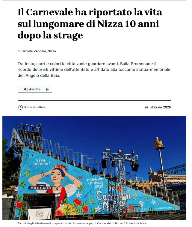 - Article sur le Carnaval de Nice dans Avvenire (Italie) – Quotidien de référence (3° au niveau nationale) diffusé à 110 OOO exemplaires dans le nord de l’italie –