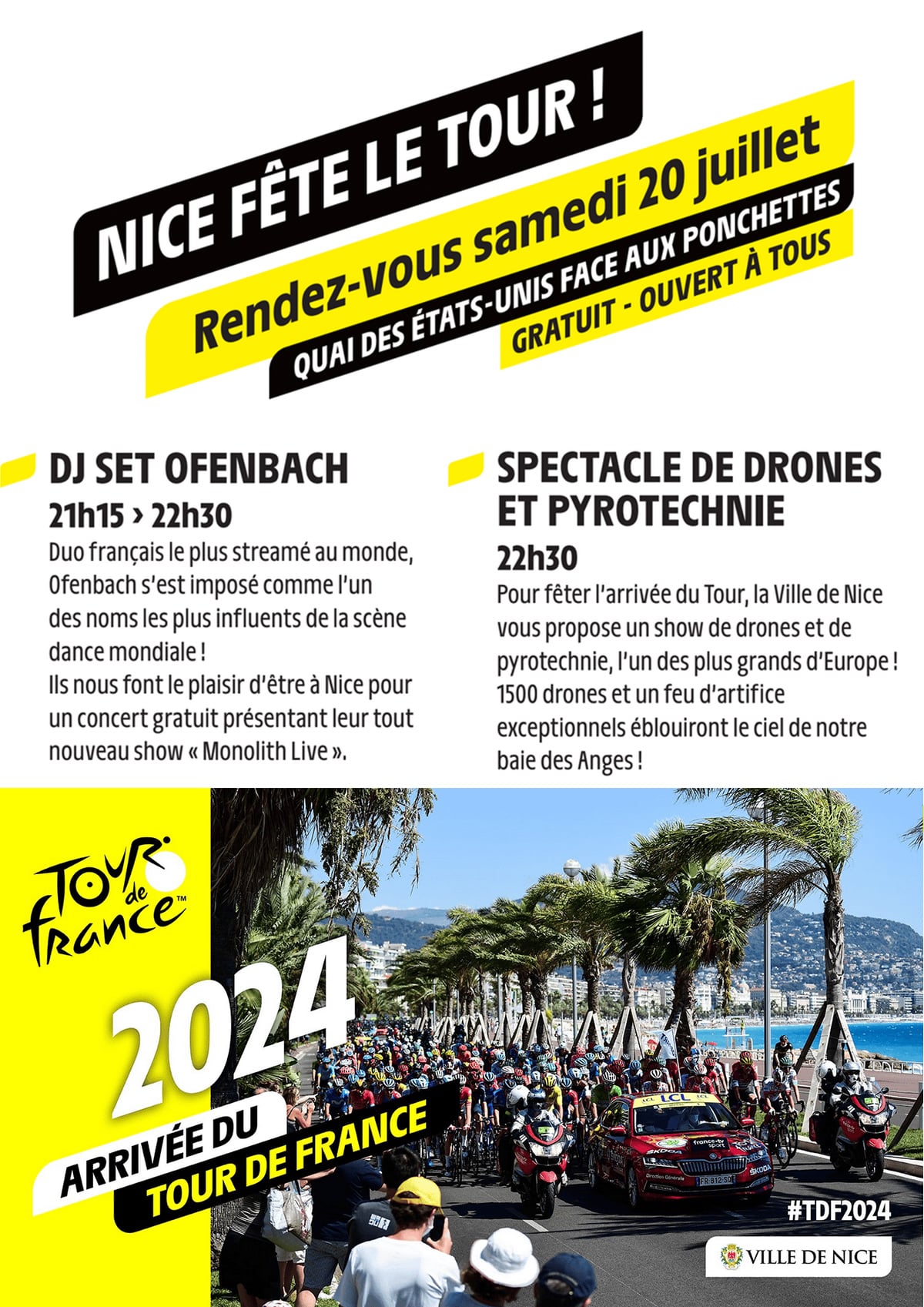 🚴♂️ Une soirée « Nice Fête le Tour ! » – Quai des États-Unis, samedi 20 juillet, avec DJ et spectacle de drones et de pyrotechnie.