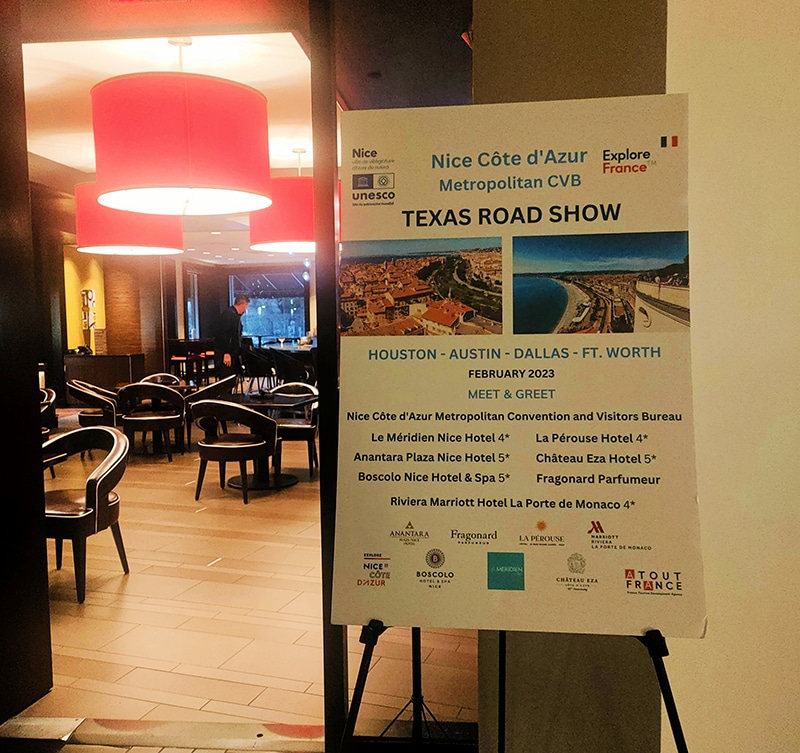 Dans le cadre d’un roadshow organisé à Houston, Austin, Dallas et Fort Worth, l’Office de Tourisme Métropolitain Nice Côte d’Azur et ses 7 partenaires (Le Méridien Nice****, l’Anantara Plaza Nice Hotel*****, l’hôtel La Pérouse Nice****, Fragonard Parfumeur, l’hôtel Riviera Marriott La Porte de Monaco****, le Boscolo Nice Hotel & Spa***** et l’hôtel Château Eza*****) sont allés à la rencontre de plus de 200 agences de voyages, tour-opérateurs haut de gamme, agences MICE, journalistes, blogueurs mais également des acteurs économiques et culturels.