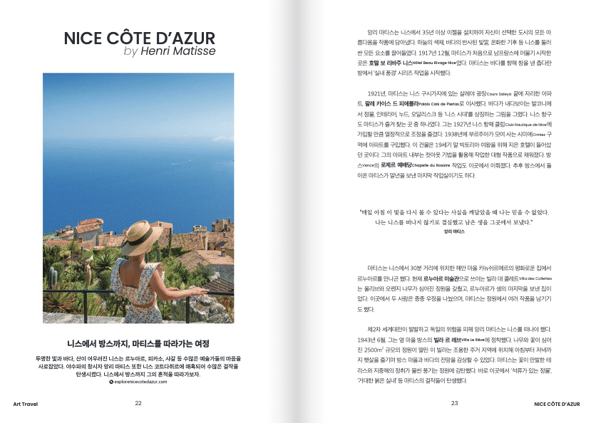 Nice Côte d’Azur y dévoile ses atouts touristiques et culturels par l’intermédiaire d’un reportage de 8 pages intitulé « Nice Côte d’Azur by Henri Matisse« . L’article évoque le peintre Henri Matisse et son attachement pour Nice Côte d’Azur. Les lecteurs peuvent aussi découvrir que le Musée Matisse de Nice est entièrement consacré à la présentation des œuvres de l’artiste.