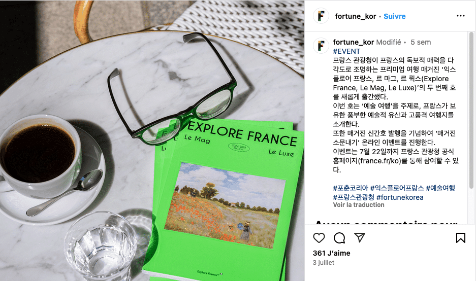 Atout France a également promu cette publication via de la communication en ligne. Une vingtaine d’articles articles/posts ont déjà été publiés dans les médias principaux et sur les réseaux sociaux des influenceurs coréens.