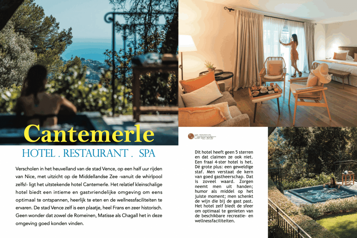 Article de 15 pages centré sur l’Hôtel & Spa Le Cantemerle à Vence, établissement présenté comme une adresse de charme au cœur de la Côte d’Azur. La commune de Vence est également mise en avant, ainsi que son attractivité auprès des grands artistes (Matisse, Chagall…) ainsi que l’inscription de Nice au patrimoine mondial de l’Unesco.