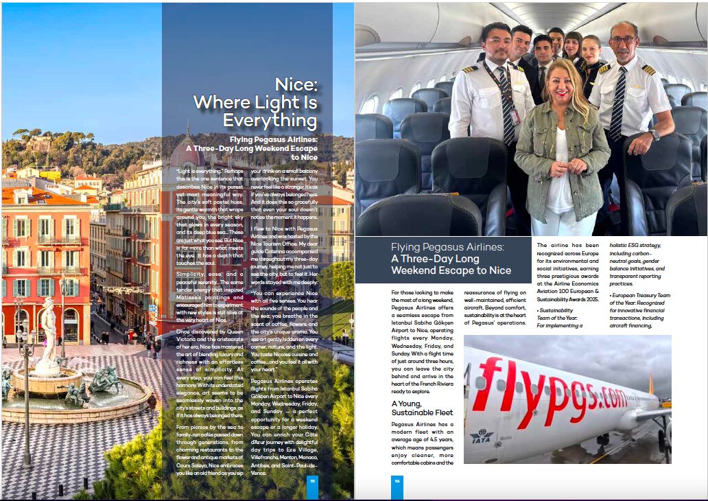 Publié dans l’édition de novembre du magazine de la compagnie Pegasus Airlines, le reportage met en lumière la destination Nice Côte d’Azur et confirme le rayonnement croissant du territoire sur les marchés turc et moyen-orientaux et auprès des professionnels de l’aviation.