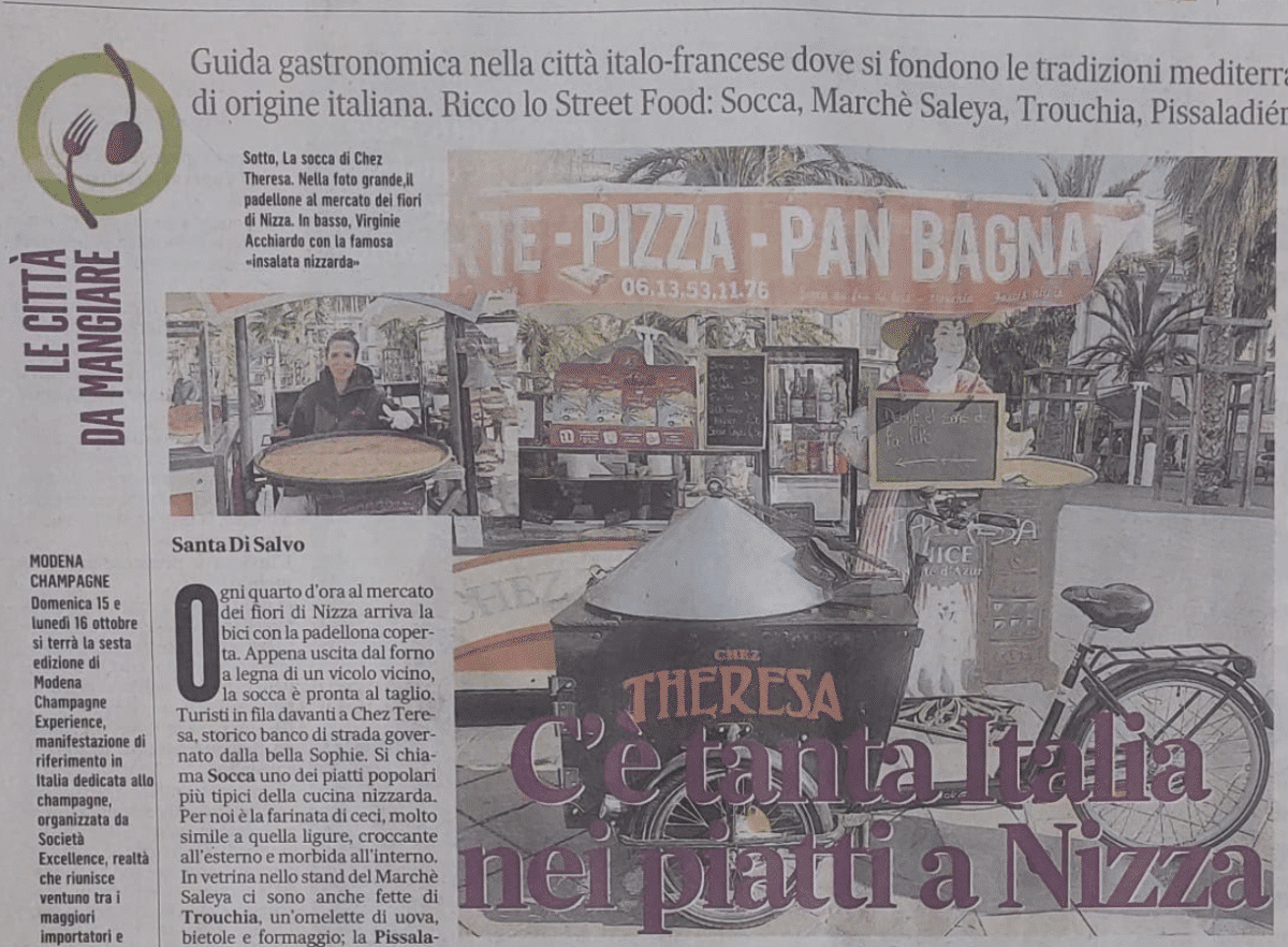 Plusieurs spécialités niçoises sont évoquées : la pissaladière, le pan bagnat ou encore la tourte de blettes. La Socca Chips, créée à partir de la socca, et son inventeur Luc SALSEDO sont également cités.