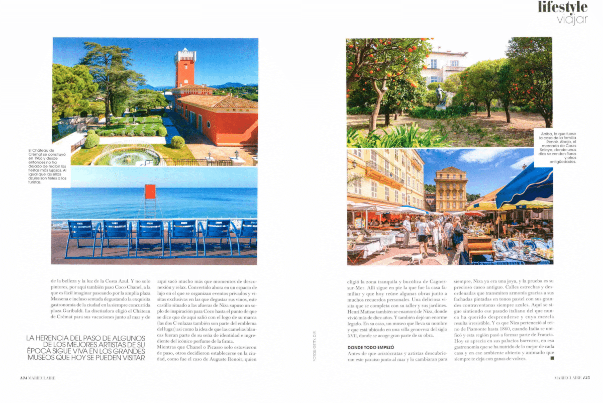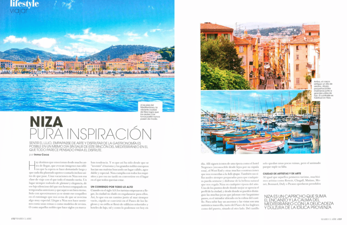 En novembre 2023, le pôle presse de l’Office de Tourisme Métropolitain Nice Côte d’Azur a accueilli un voyage de presse, en collaboration avec Atout FranceEspagne. S’en sont rapidement suivies plusieurs publications mettant en lumière la destination Nice Côte d’Azur (cf article blog du 21 décembre 2023). Toujours consécutif à cet accueil, un nouvel article s’est invité cet été dans la presse féminine espagnole, au sein du magazine Marie-Claire.