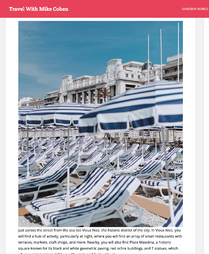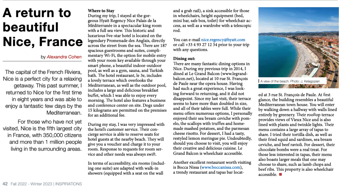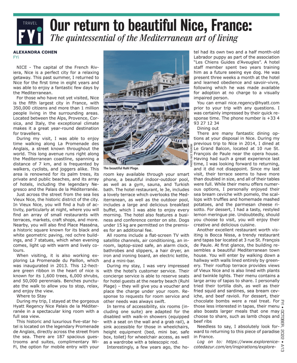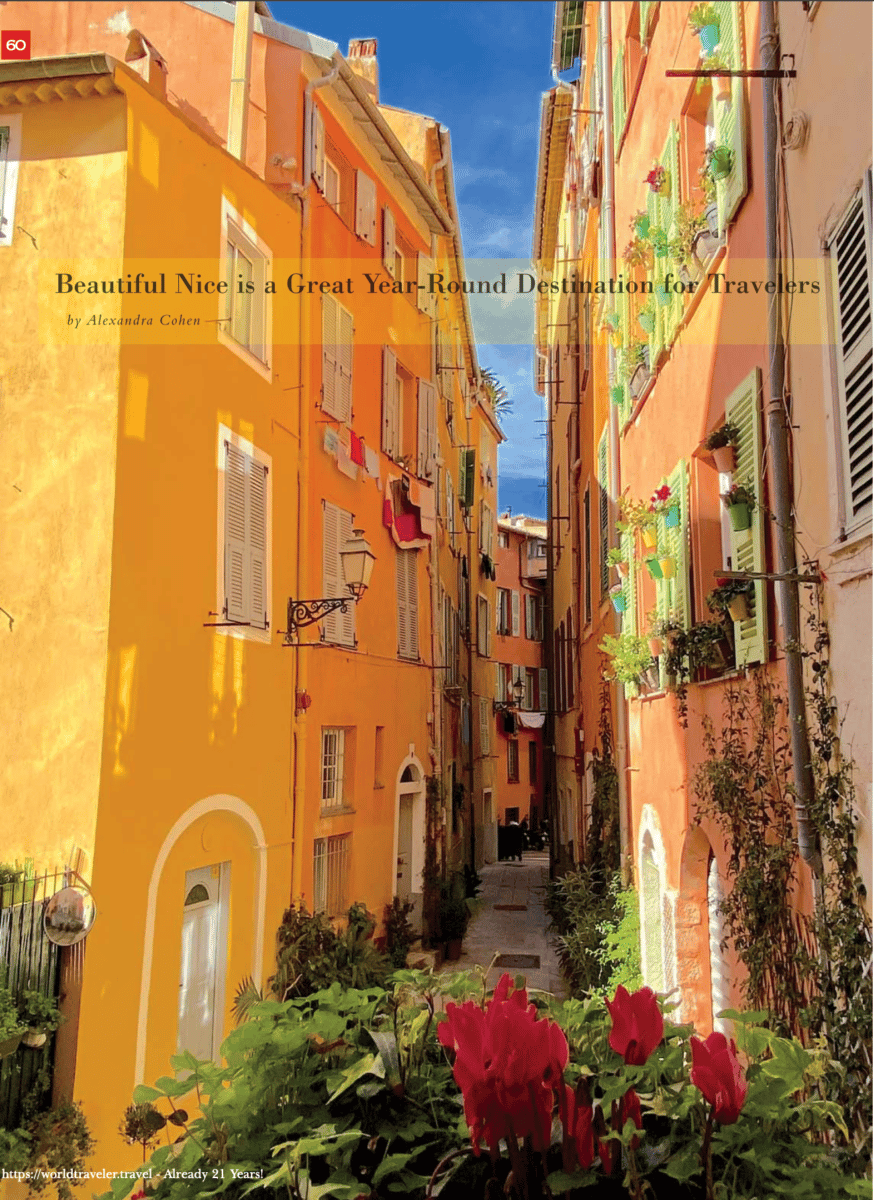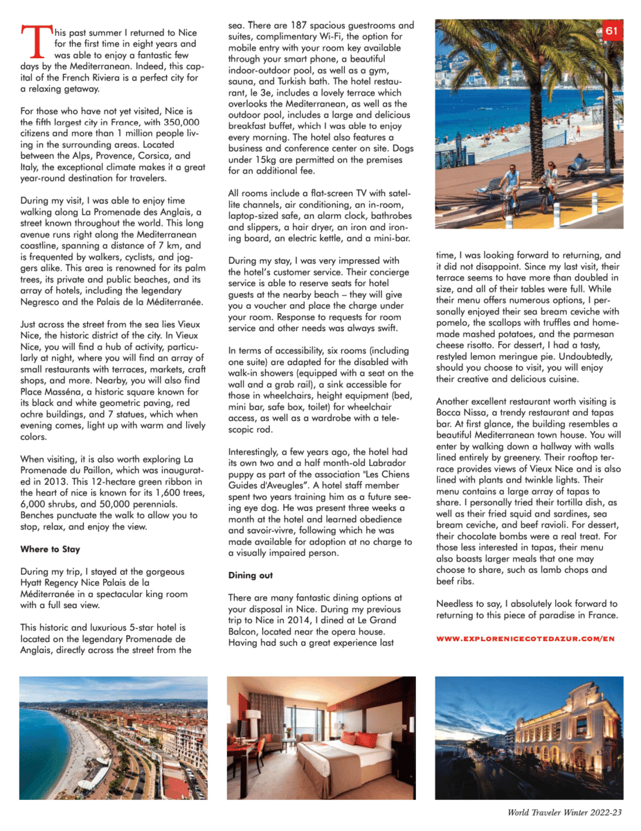 L’article paru dans le magazine « World Traveler » en décembre 2022 met en avant la beauté et la richesse touristique de Nice en toute saison, même si la journaliste free lance est venue visiter la capitale azuréenne durant l’été dernier avec sa famille. L’auteure évoque son plaisir à séjourner à Nice et les lieux qui l’ont particulièrement inspirée (Hôtel Hyatt Regency Nice Palais de la Méditerranée, Le Grand Balcon et le Bocca Nissa).