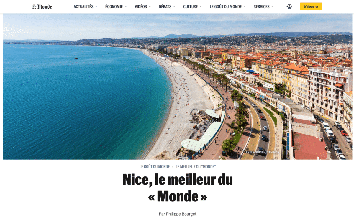 Le site du journal Le Monde a récemment publié un article sur Nice avec une sélection de 20 adresses phares. Cette parution fait suite à un accueil réalisé en janvier 2024 par le pôle presse de l’Office de Tourisme Métropolitain Nice Côte d’Azur ; accueil initié lors de l’Assemblée Générale de l’Association des Journalistes du Tourisme (AJT) qui a rassemblé à Nice plusieurs dizaines de journalistes généralistes et spécialistes du voyage en novembre 2023.