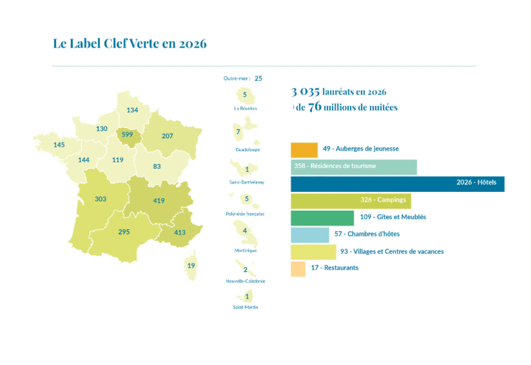 Cette année, 3035 hôtels, campings, résidences de tourisme, gîtes, chambres d’hôtes, villages vacances, auberges de jeunesse et restaurants sont détenteurs du label international Clef Verte : soit 25% de plus qu’en 2025 : un nouveau record pour la Clef Verte qui entrainera une économie d’environ 3,8 milliards de litres d’eau.