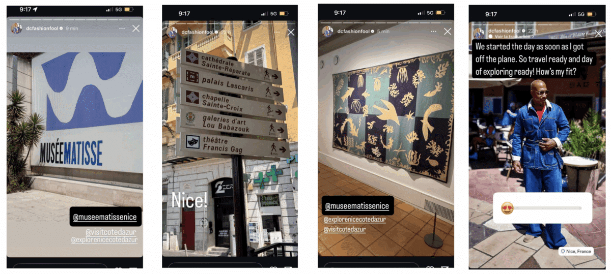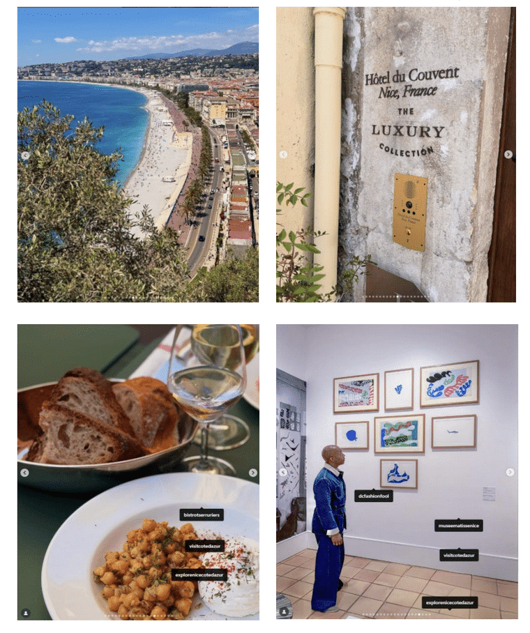 - Des dizaines de milliers de vues, likes et interactions via plusieurs publications sur Instagram mettant en valeur leur expérience à Nice (reels, stories et publications) avec mise à l’honneur Nice, l’Hôtel du Couvent, le Bistrot des Serruriers et le musée Matisse,