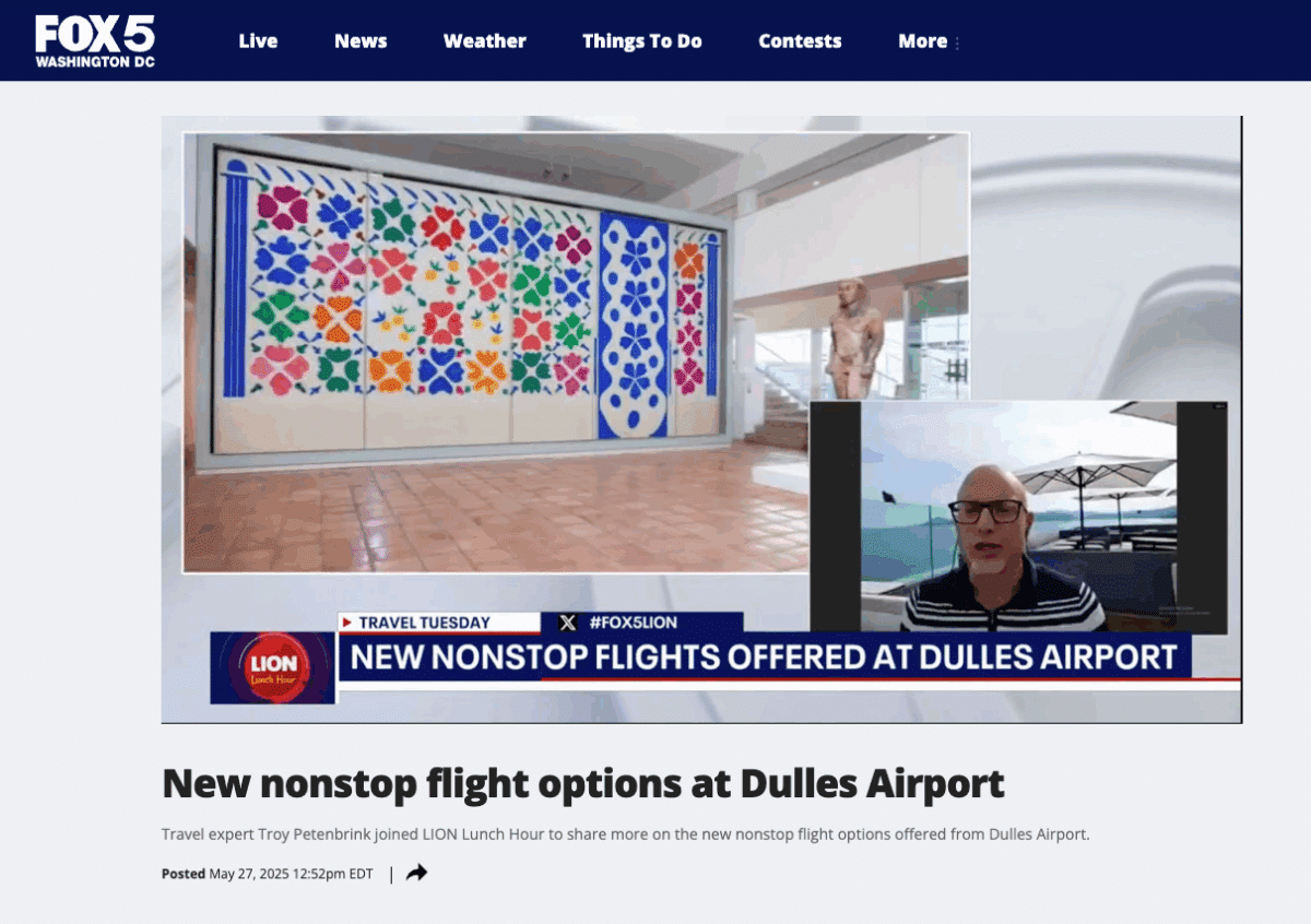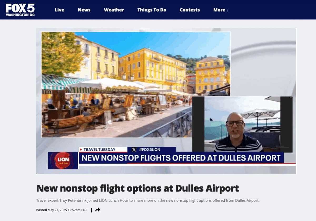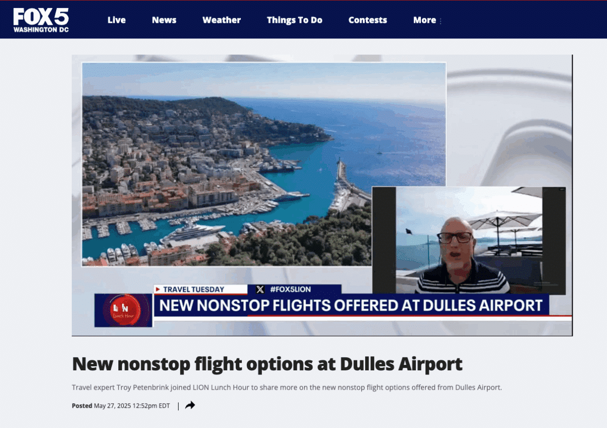 Le 25 mai 2025, un journaliste free lance et son cameraman (également influenceur lifestyle) ont été accueillis à Nice par l’Office de Tourisme Métropolitain Nice Côte d’Azur, dans le cadre d’un voyage de presse initié par Côte d’Azur France Tourisme et Atout France USA, en partenariat avec United Airlines. Cet accueil avait vocation à valoriser l’ouverture de la liaison directe entre l’aéroport international de Washington-Dulles et l’aéroport Nice Côte d’Azur, opérée par United Airlines. Des contenus mettant en avant la destination Nice Côte d’Azur ont été diffusés sur la chaine américaine « Fox 5 DC « , chaine locale de Fox News dans les régions de Washington DC, Virginie et du Maryland ainsi que sur les réseaux sociaux.
