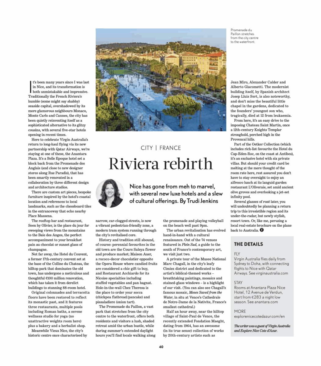 Dans l’article “Riviera Rebirth”, la journaliste Trudi JENKINS décrit une Nice transformée, désormais concurrente chic de ses voisines Cannes et Monaco. Elle souligne la richesse culturelle et l’offre hôtelière montante, avec une mention particulière pour l’Anantara Plaza, le Musée Chagall, la Fondation Maeght, et les restaurants locaux emblématiques comme Acchiardo.