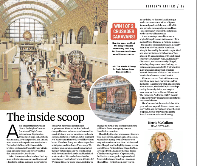 Dans son éditorial, Kerrie McCALLUM, revient sur ses moments marquants à Nice Côte d’Azur : baignade improvisée sur la plage de galets, visite enrichissante du Musée Chagall, et découverte de la Fondation Maeght à Saint-Paul-de-Vence. Elle conclut sur une dégustation dans les caves de Cave Bianchi, soulignant la richesse de l’expérience vécue.