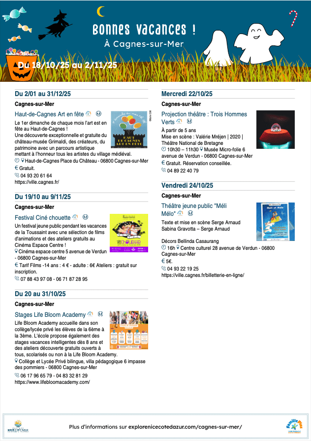 Les vacances de la Toussaint sont là, et avec elles, l’occasion idéale de partager des moments privilégiés en famille ! Pour accompagner petits et grands dans la découverte des multiples animations proposées, et fidèle à ses engagement de destination « Famille Plus », l’Office de Tourisme Nice Côte d’Azur vient de sortir un nouvel agenda Famille Plus spécial « Vacances de la Toussaint » (du samedi 18 octobre au dimanche 2 novembre 2025) et de la fête d’Halloween.