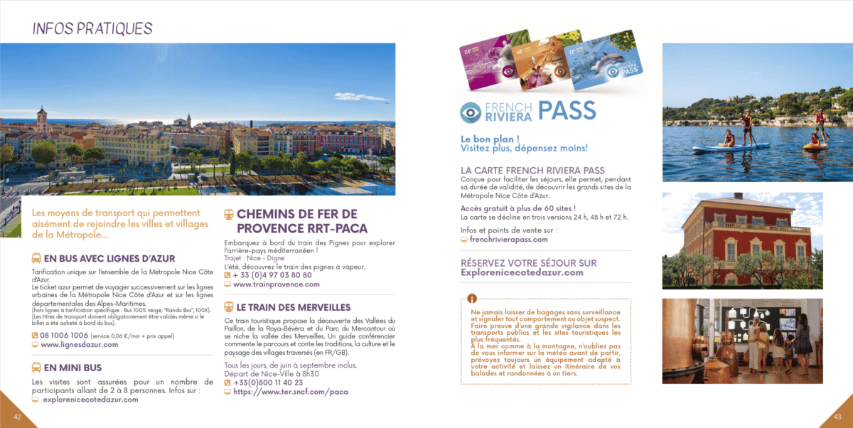 Parmi les nouveautés de cette édition, une couverture reprenant la charte graphique de l’OTM (ci-dessus), une page dédiée à l’inscription de Nice sur la liste du patrimoine mondial de l’Unesco, l’intégration des communes de Drap et de Châteauneuf-Villevieille qui ont officiellement rejoint la métropole Nice Côte d’Azur au 1er janvier 2022 et une place plus importante accordée à la promotion du French Riviera Pass.