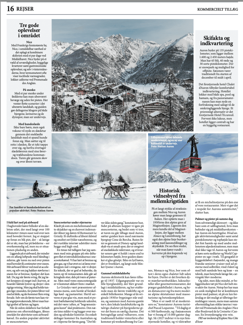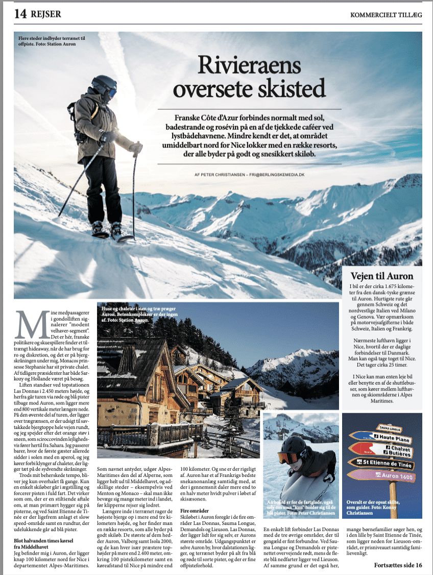 Le journaliste Peter CHRISTIANSEN consacre son article de deux pages au haut-pays de Nice Côte d’Azur et à ses stations de ski réputées pour leur enneigement fiable et la qualité de leurs pistes. Il met notamment en avant Auron, son cadre exclusif, son ambiance authentique et la diversité de ses publics et de ses pistes qui, réparties sur quatre secteurs (Las Donnas, Sauma Longue, Demandols et Lieuson), offrent une expérience fluide et variée, aux familles comme aux skieurs expérimentés. Le journaliste met aussi l’accent sur la proximité mer / montagne qui participe à l’attractivité de ce territoire.