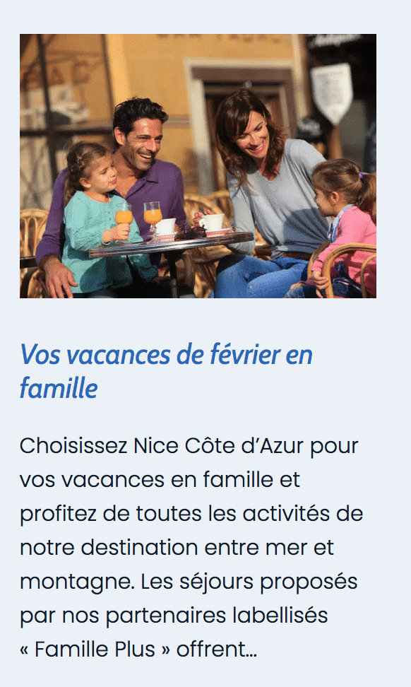 L’Office de Tourisme Métropolitain Nice Côte d’Azur a travaillé avec ses partenaires hébergeurs pour proposer, sur sa plateforme de marchés, des offres de séjour pour les familles à l’occasion des vacances de février 2022.