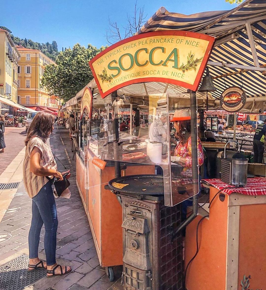 Parfois, elle m’achète une part de socca cuite au feu de bois. C’est bon et ça se mange bien chaud, comme ça avec les mains ! On finit toujours par acheter aussi un petit bouquet de fleurs sur ce joli marché.