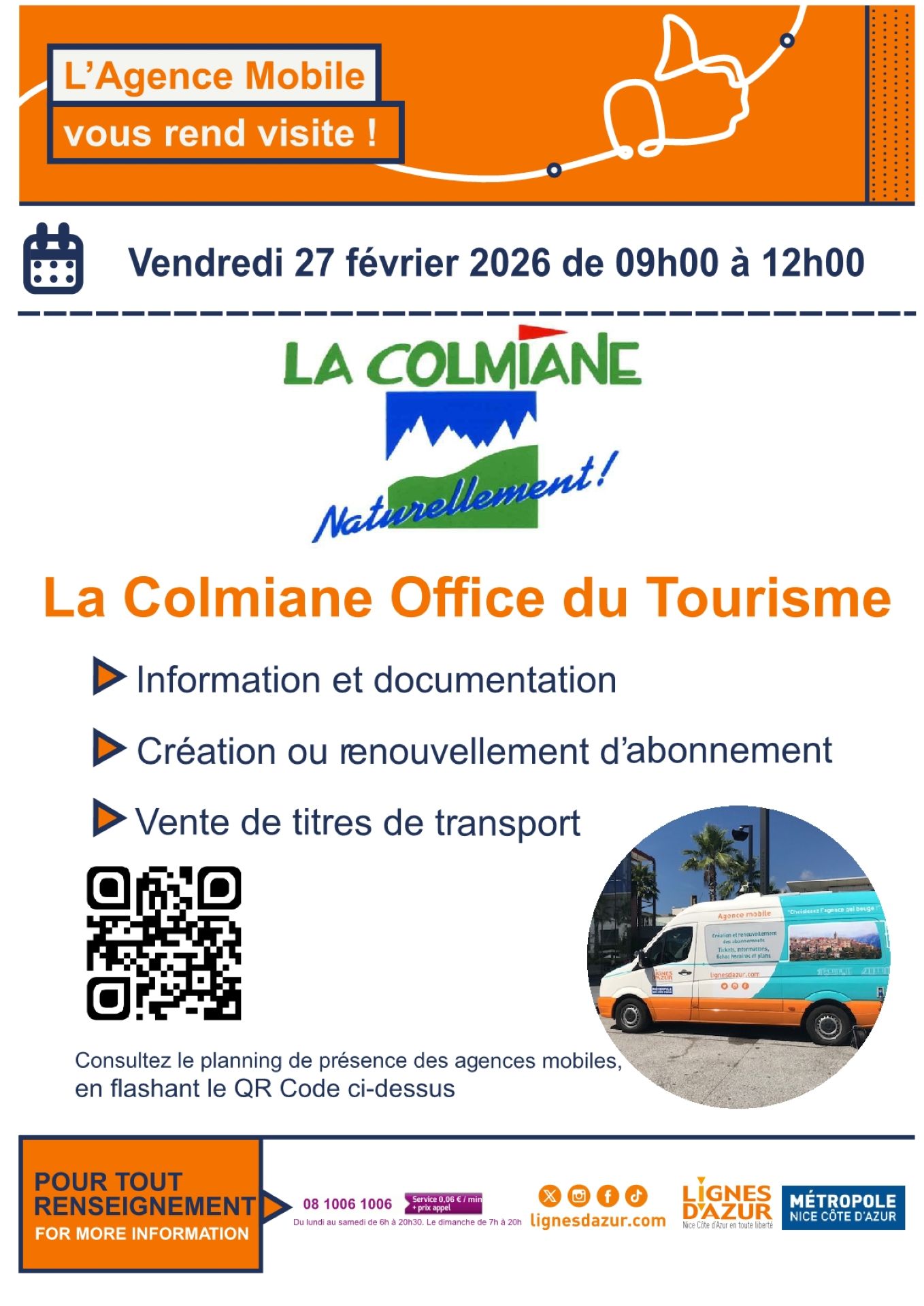 Lors de cette permanence, l’Agence Mobile des Lignes d’Azur propose les mêmes services qu’une agence classique :
