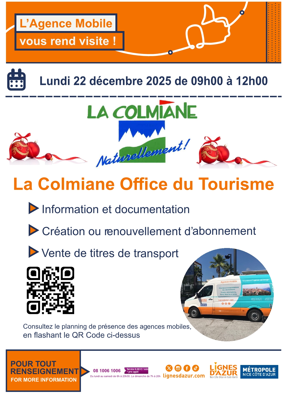Agence Mobile des Lignes d'Azur à La Colmiane de 09h à 12h.