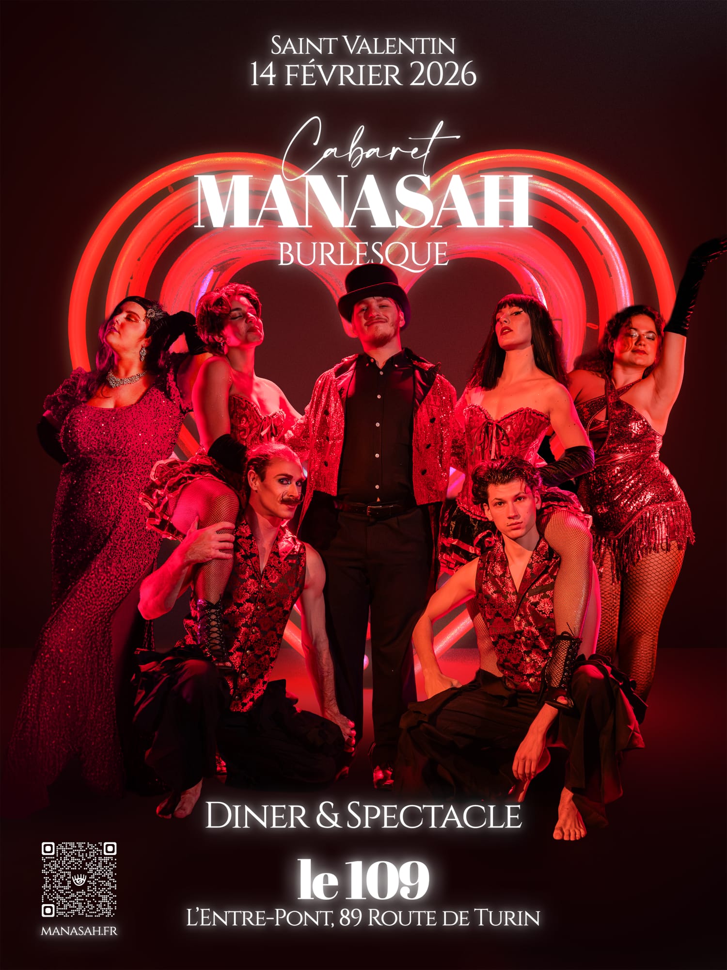 Beneath the rhinestones, feathers and frantic heartbeats, Manasah celebrates love in all its forms. A fiery and irreverent cabaret where passion flirts with irony, where bodies tell what words cannot.