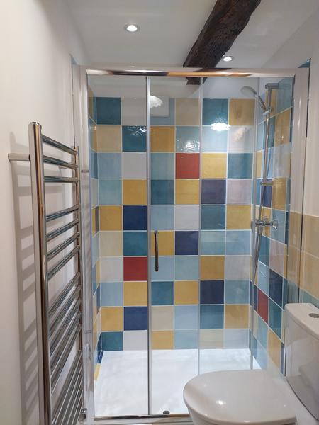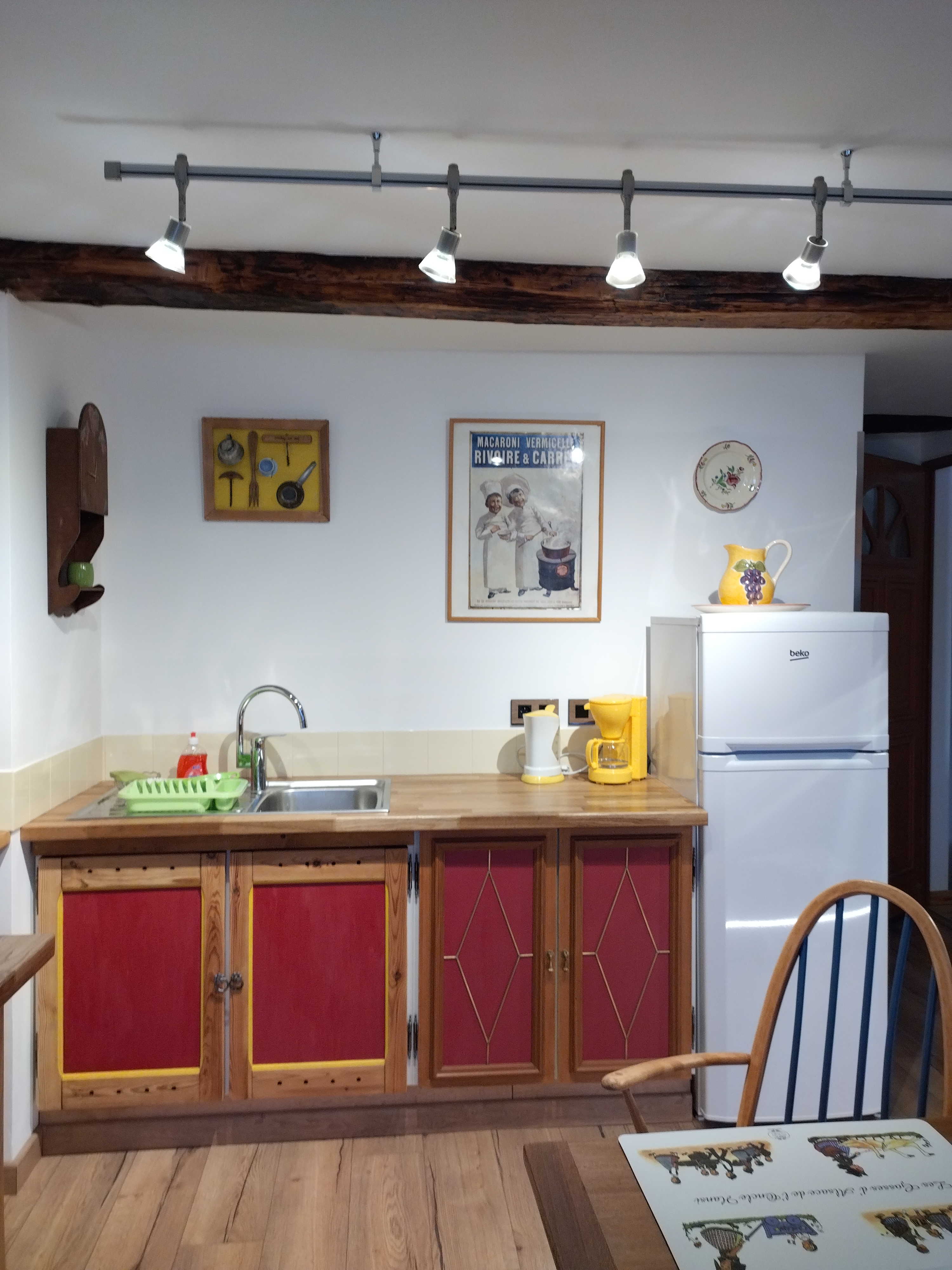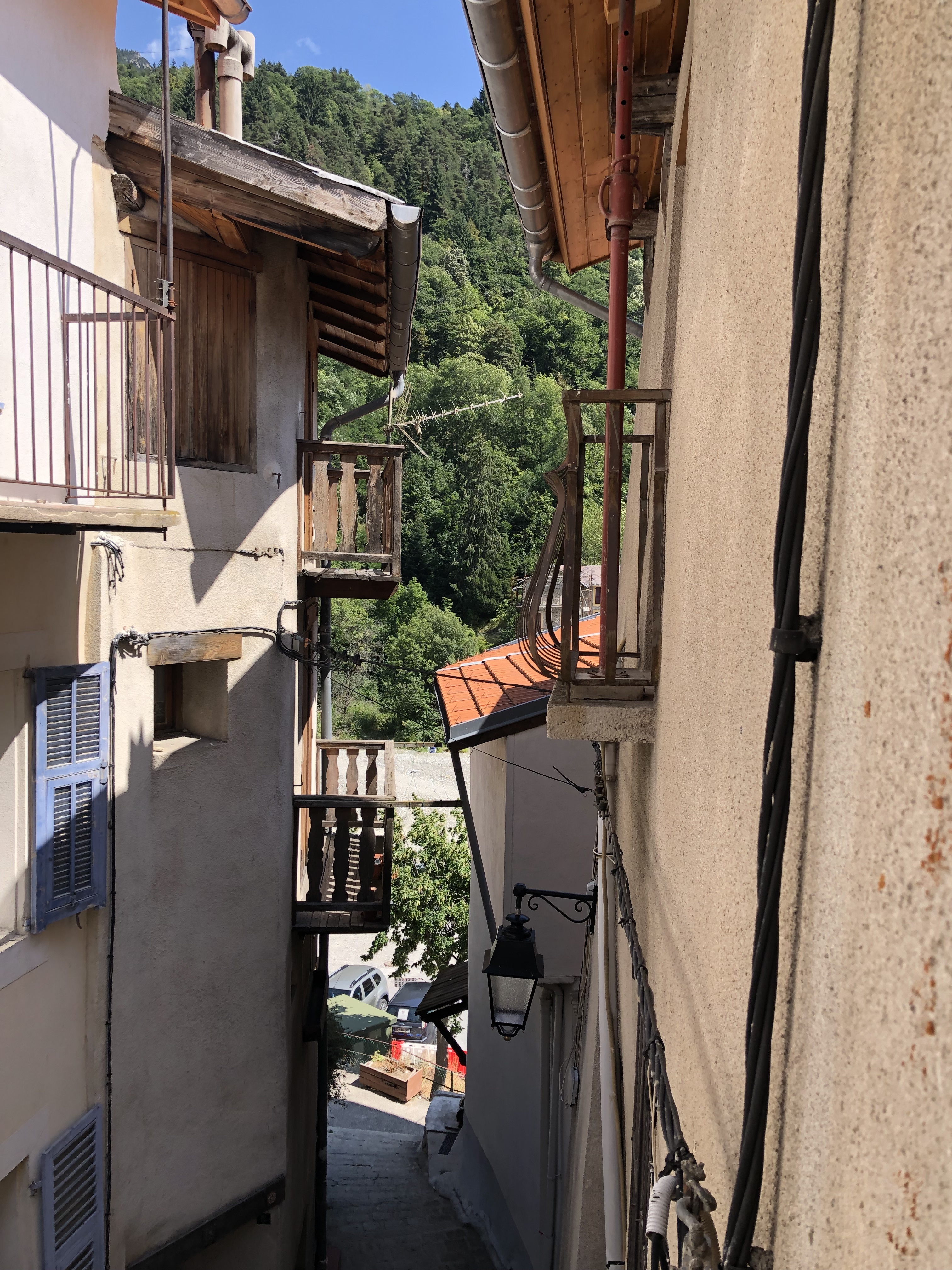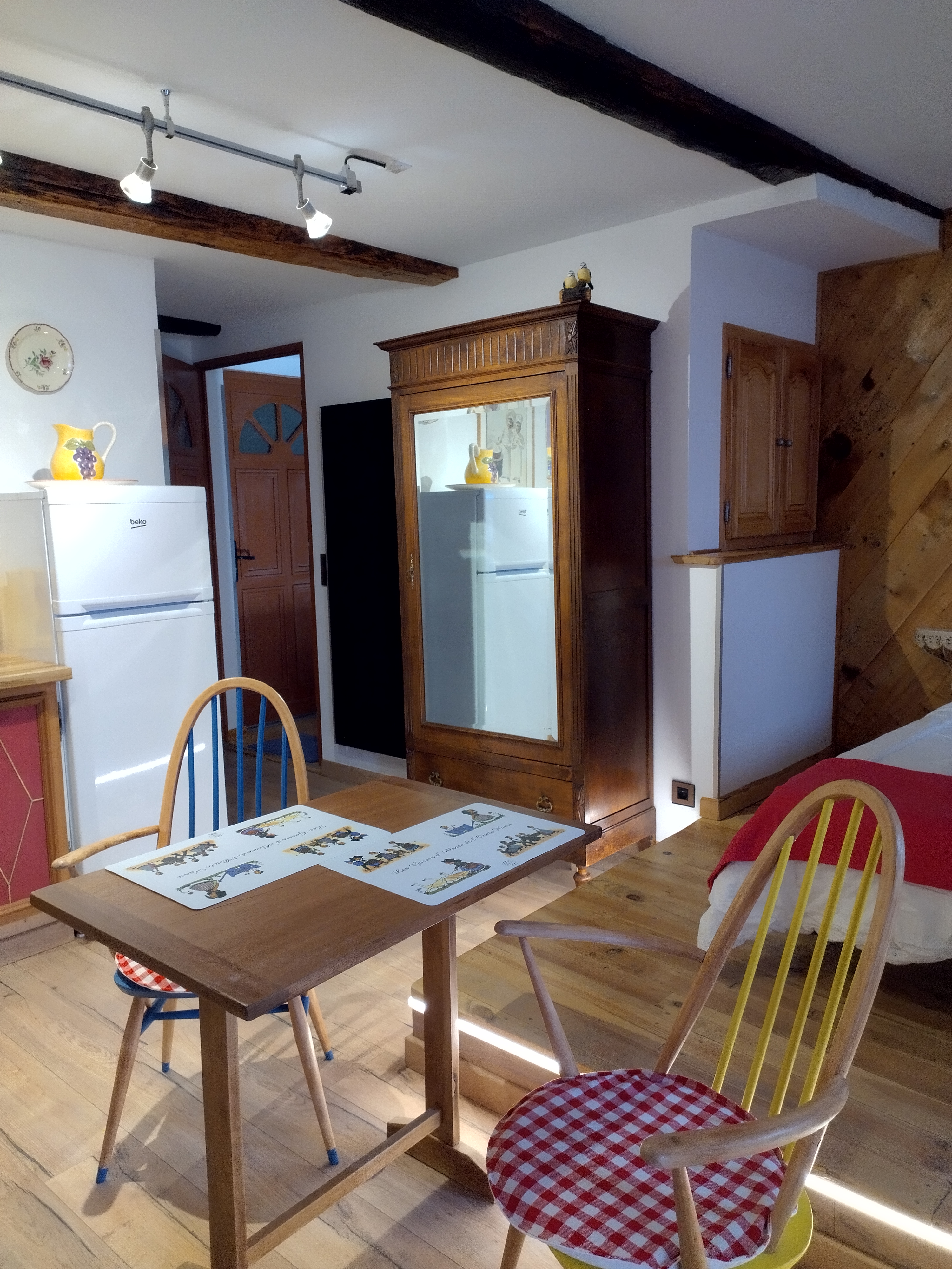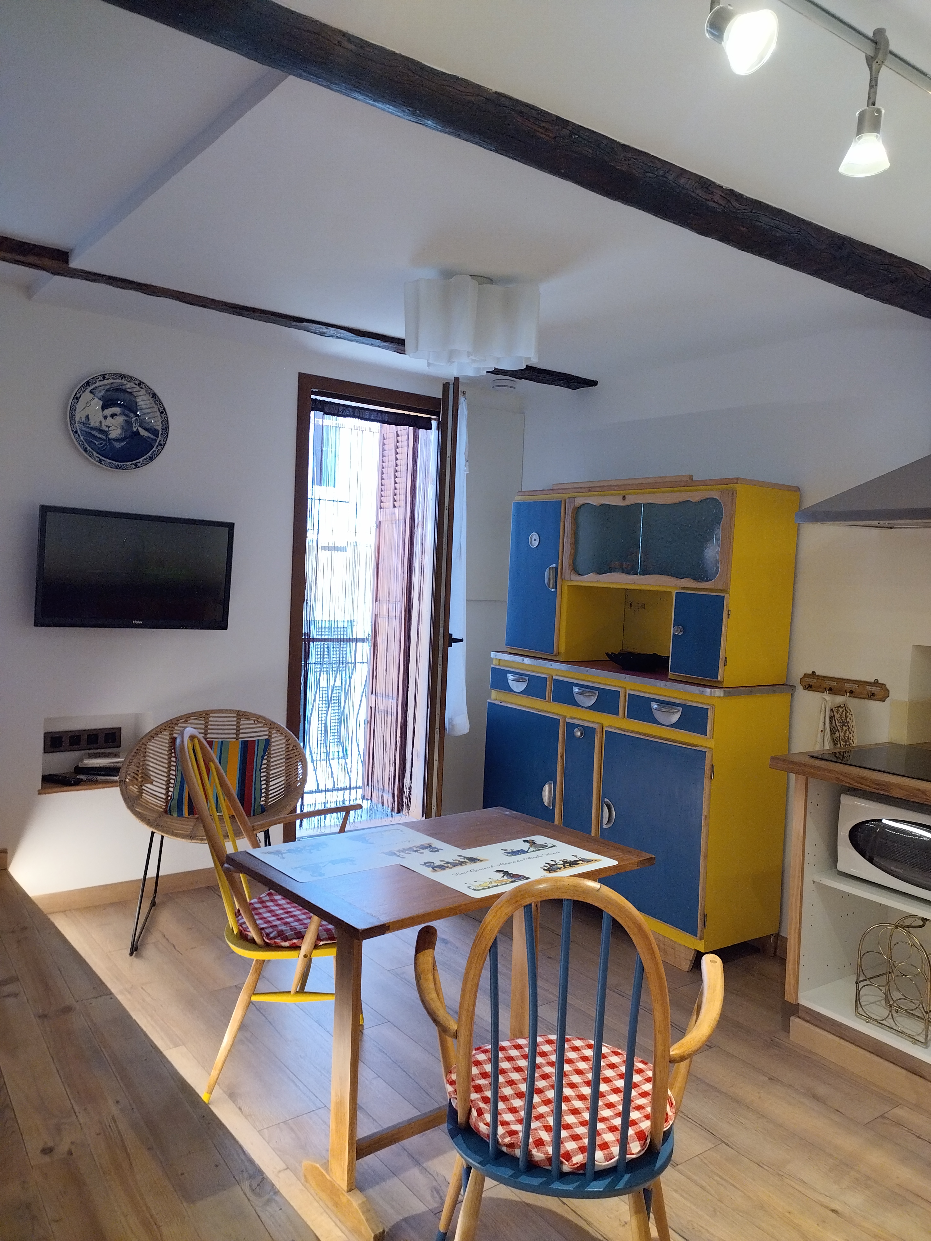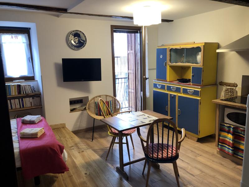 Large, fully renovated studio in the old center of Saint-Martin Vésubie, located on the second floor of a house at the bottom of the village, in a quiet street.