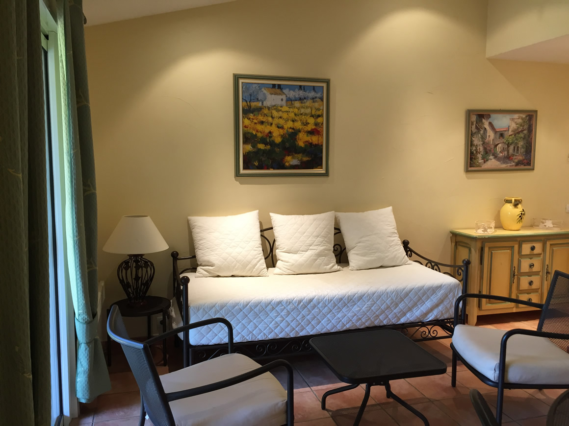 Semi-detached villa in a domain composed of 8 villas. Its large private garden and terraces, fenced in and not overlooked, will offer you a restful setting in the heart of lush vegetation. The villa is composed of a living room with a fully equipped American kitchen, a comfortable sofa bed, a bedroom, a bathroom, a separate toilet and a master suite with its bathroom. Relax in the magnificent communal lagoon pool or rest on one of the many sunbeds.