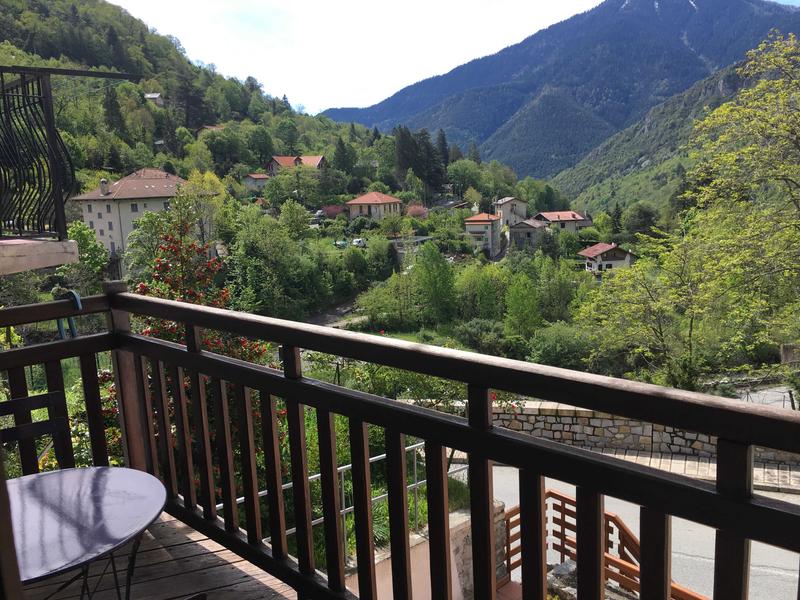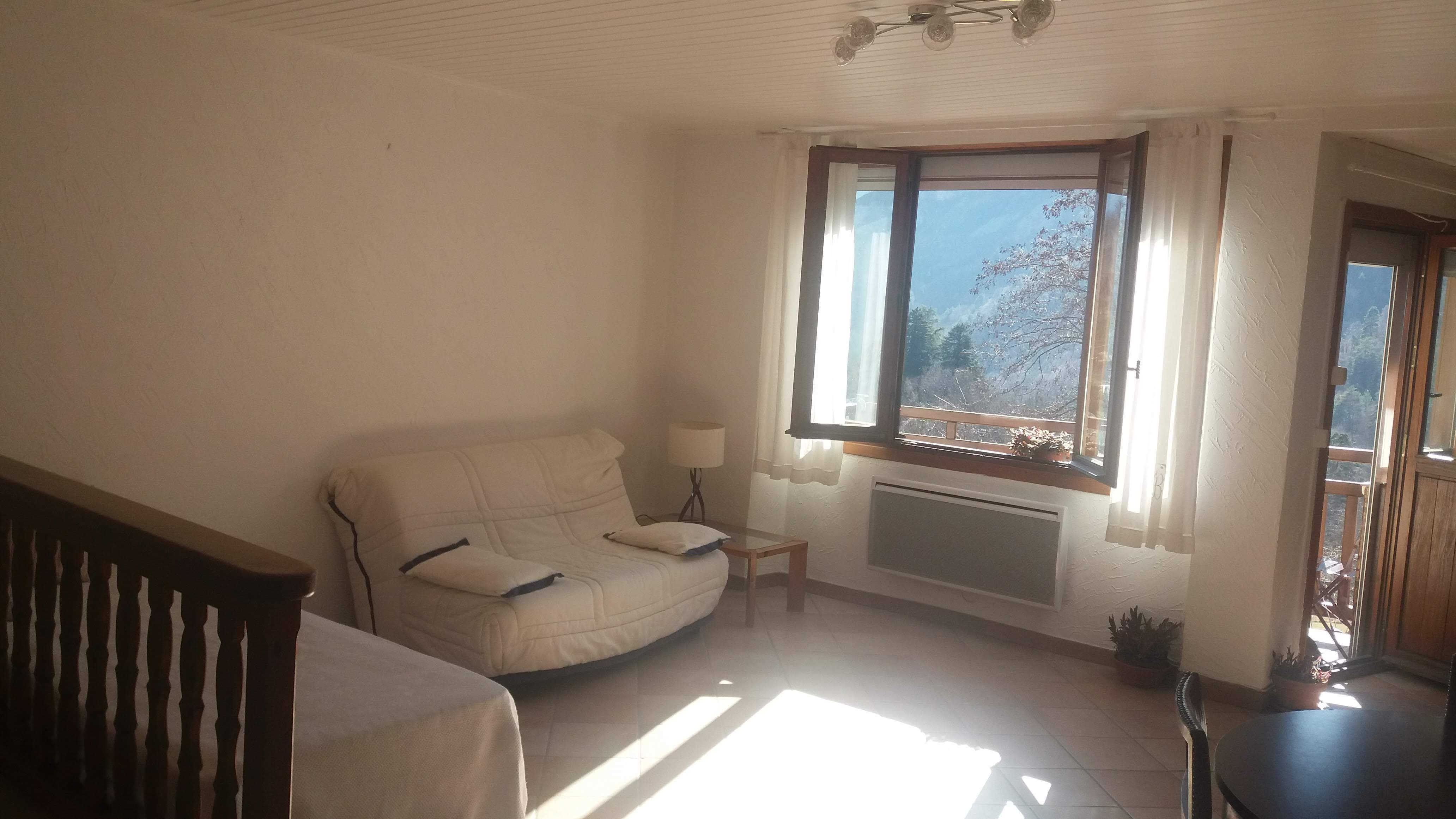 F2 traversant situé en bordure du village, au 1er étage, ensoleillé et orienté plein sud, balcon 3 m² avec vue sur montagnes et vallée.