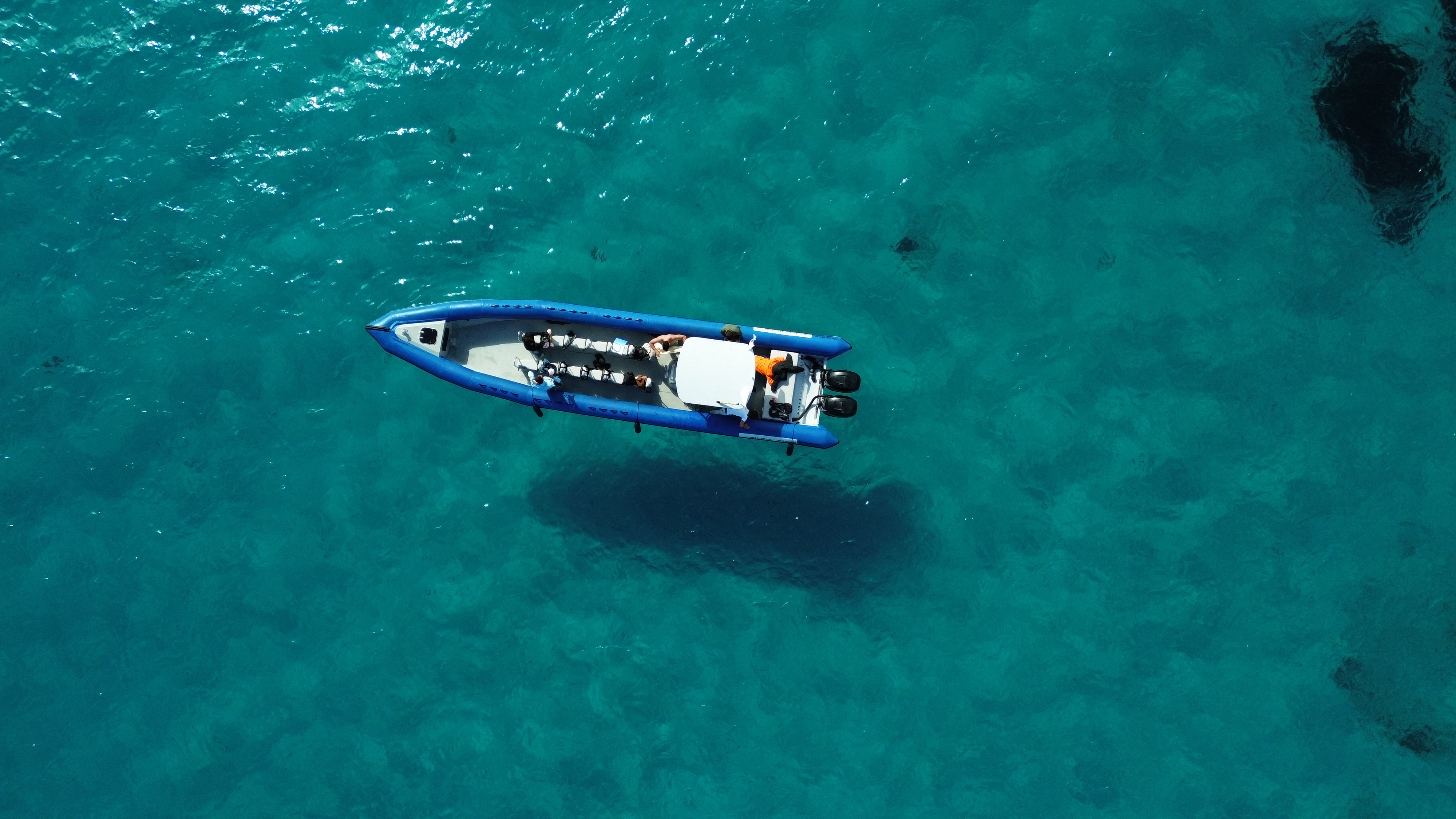 Aboard our 12-meter semi-rigid, equipped with 700 horsepower and able to accommodate up to 24 passengers.