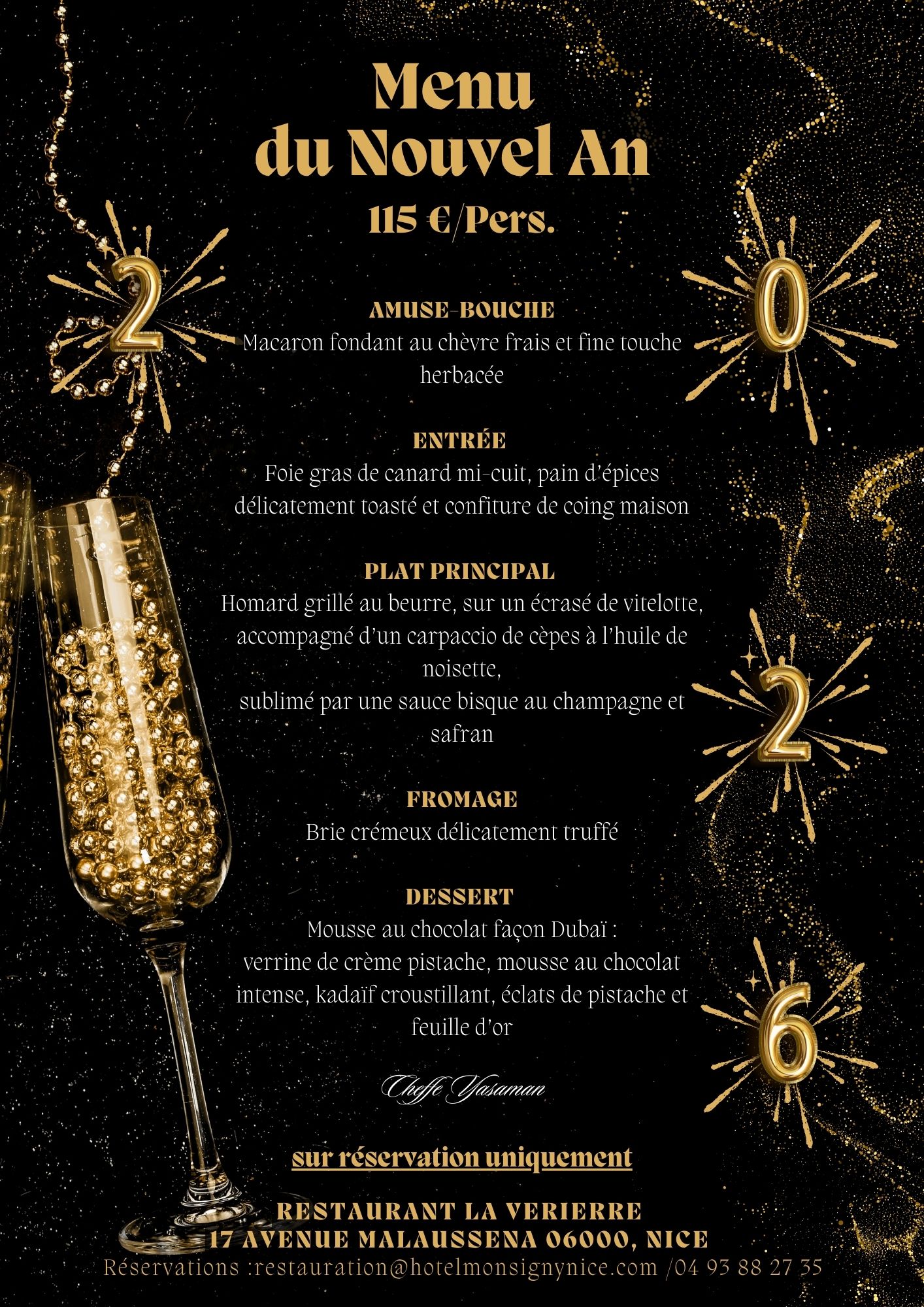 Celebrate New Year's Eve in style with our gourmet New Year's menu at €115: grilled lobster, foie gras, refined amuse-bouche, truffled cheese, and a signature Dubai-style dessert. An exceptional dinner to ring in 2026.