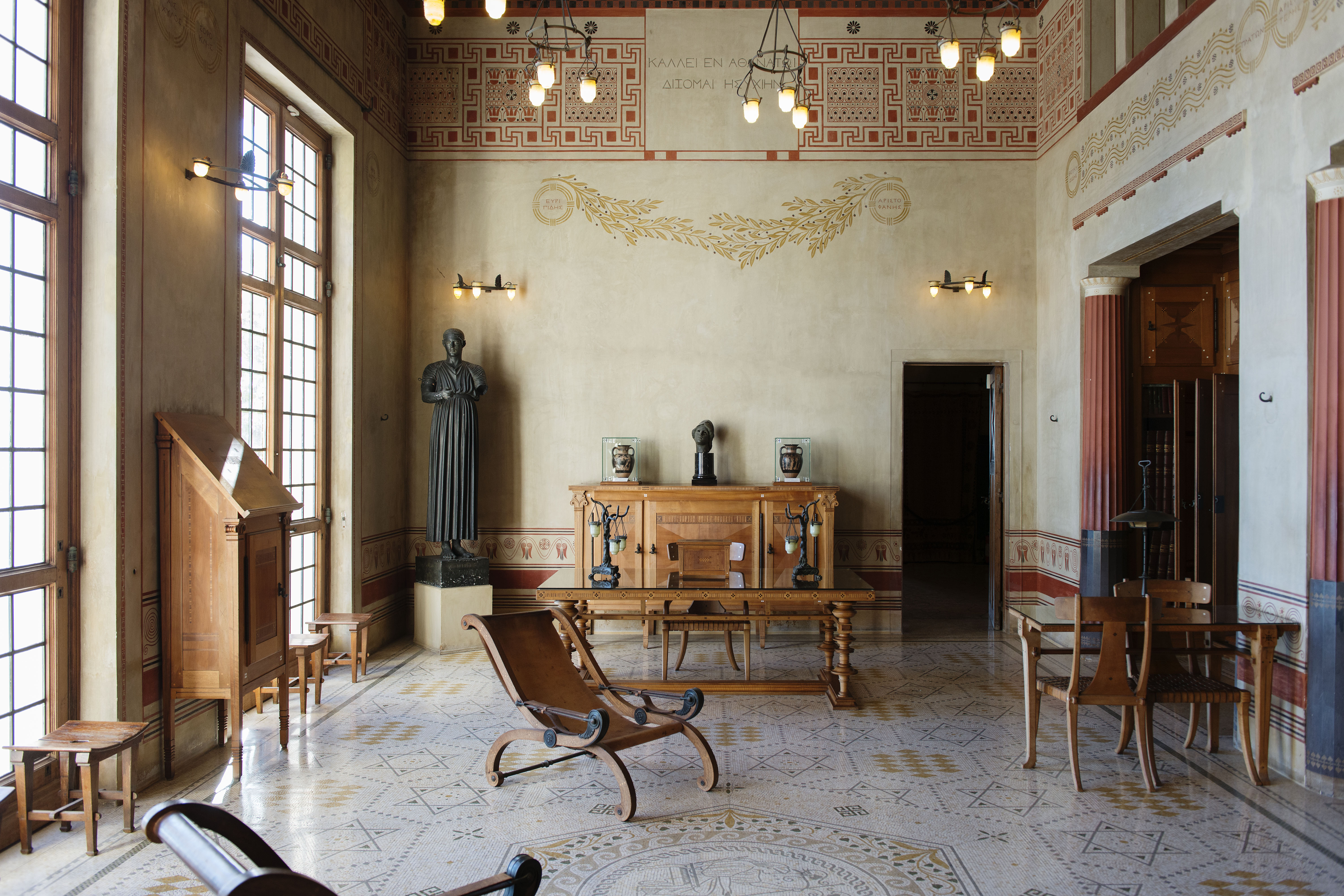 Built around an open-air courtyard, the Villa evokes the daily lives of the Greeks of the Hellenistic era, with all modern conveniences. Frescoes, furniture, mosaics were copied from the classics from vases and archaeological remains.
