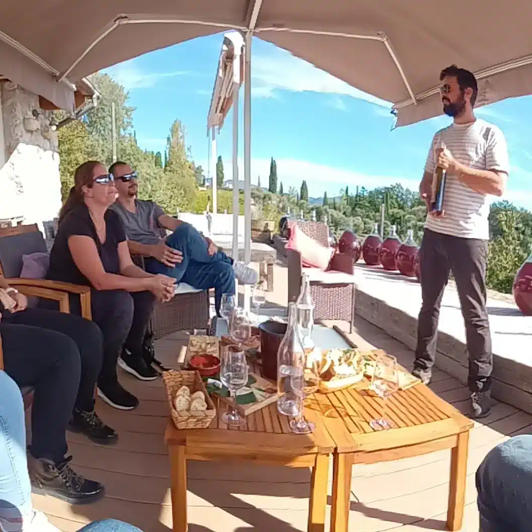 Our visit begins with a brief presentation of the estate, followed by an explanation from the winemaker about the different grape varieties grown in the vineyard. We thus discover that in ancient times the Romans were already working these lands and producing grapes.