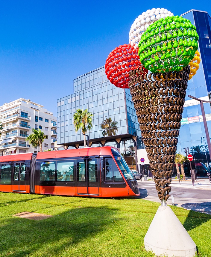 With the opening of line 2 in 2019, eleven new works of art have been installed alongside the tracks. You won’t remain indifferent to Joanna Vasconcelos’ huge “Fruitée” ice cream cone, Noël Dolla‘s intriguing “Lou Che” sculpture at Port-Lympia, or Sacha Sosno‘s “Homage to Venus” and “Poseidon”. Going throuh the brand new Garibaldi le Château tramway station, you will come across the spectacular sculpture by Ernest Pignon Ernest, a pioneer of urban art, “Pépin, la Déesse et la Mer”.