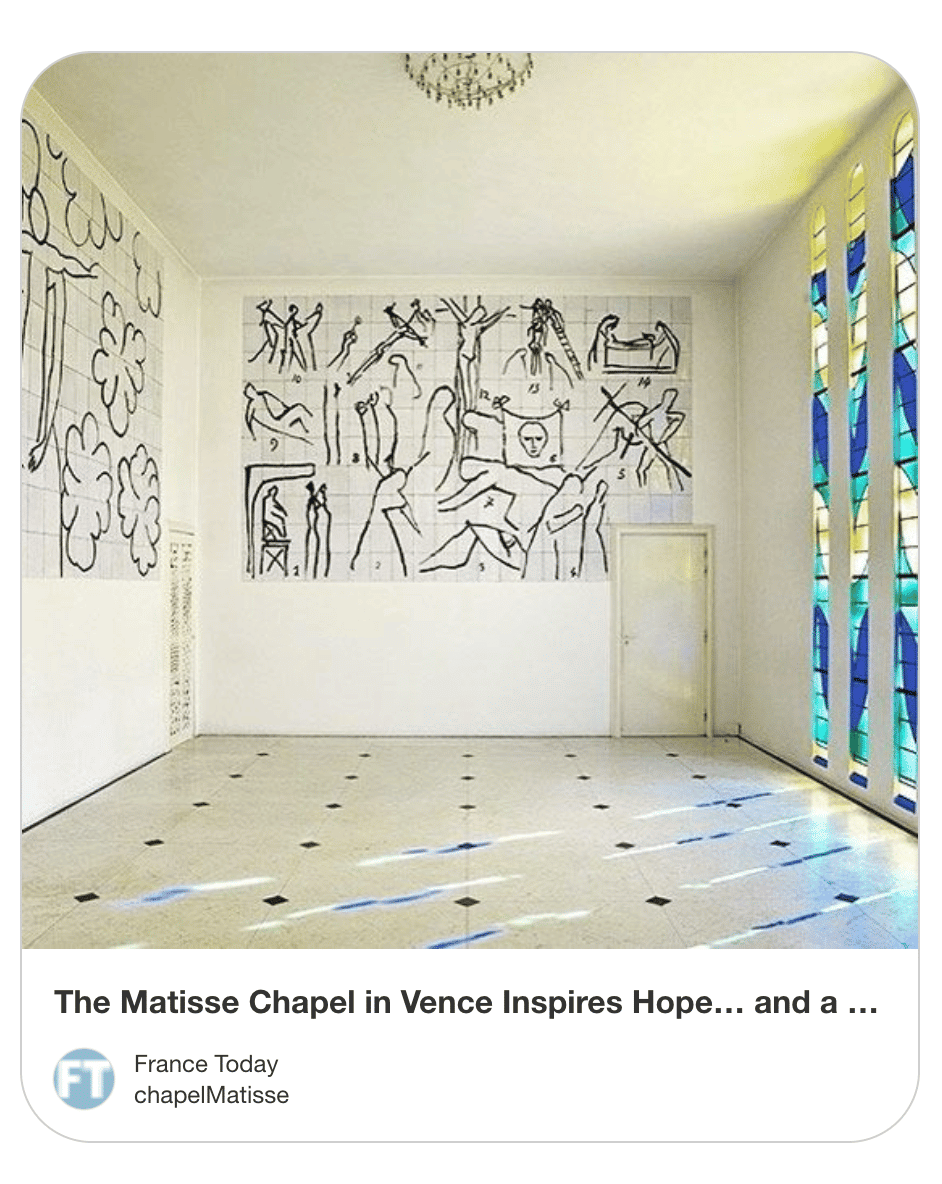 In 1947, the painter accepted a commission from a Dominican nun, a friend and former model who had posed for him. The nun asked him to make a stained glass window for the garage that served as the chapel of her congregation. At the age of 78, Matisse took the project to heart and decided to start a new construction. Wanting to create a total work of art, the master designed the entire chapel, from the very simple white architecture to the refined interior decoration, from the stained glass windows to the furniture and even half a dozen chasubles for the officiants. Begun in 1948, the Rosary Chapel was inaugurated on 25 June 1951. The artist later declared it to be his masterpiece and artistic testament.