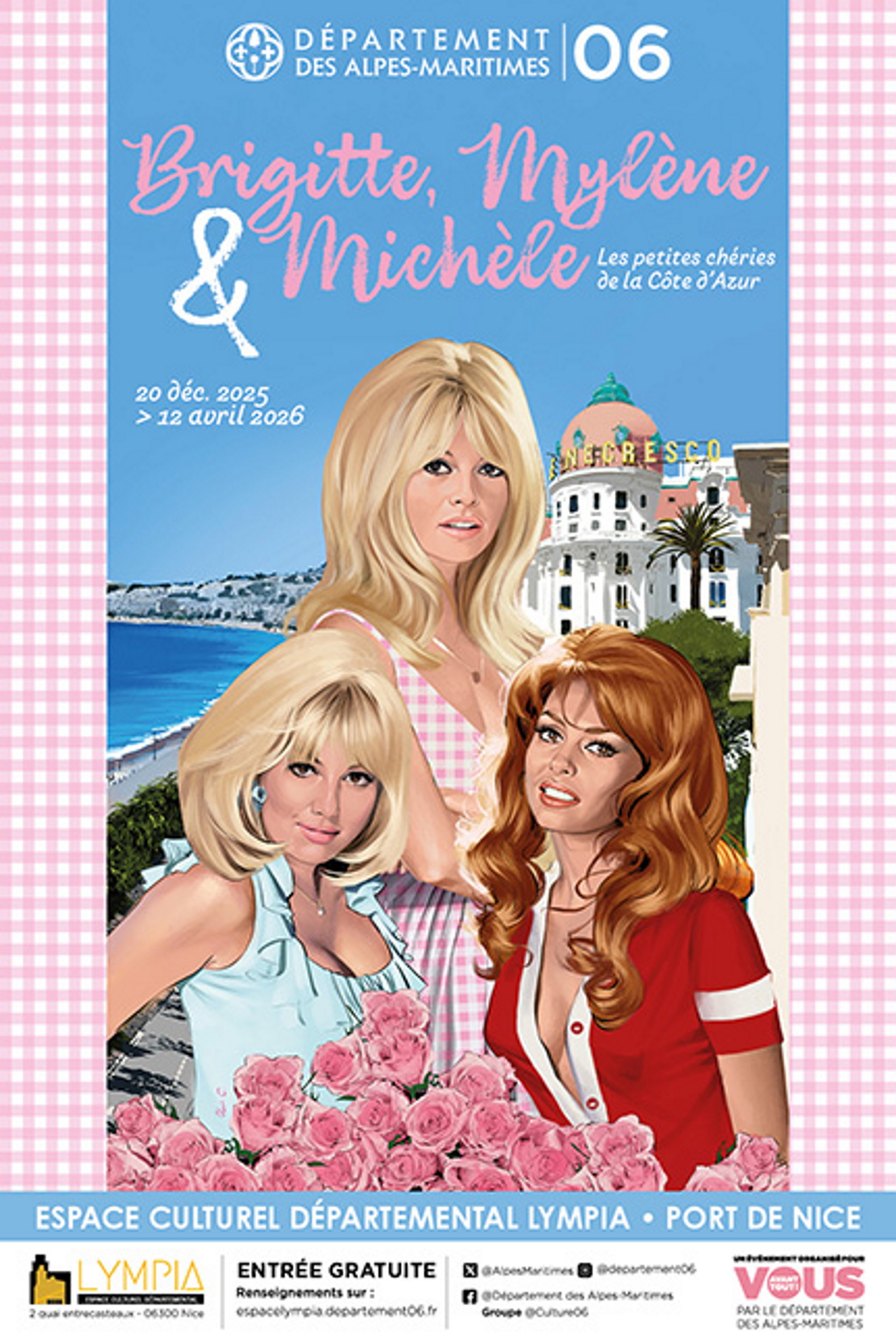 L’exposition à l’espace culturel départemental Lympia à Nice, organisée par Henry-Jean Servat, célèbre Brigitte Bardot, Mylène Demongeot et Michèle Mercier. A travers plusieurs thématiques, le public pourra découvrir une sélection de photographies, vidéos, objets personnels, affiches et archives illustrant leurs vies, leurs films et leur influence sur la Côte d’Azur, haut-lieu du cinéma international qu’elles ont marqué de leur empreinte.